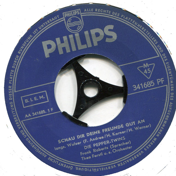 ?? 63....341 685 PF....DIE PEPPER TWINS Frank Roberts (Sprecher) Theo Ferstl u. s. Orchester..Schau dir deine Freunde gut an/FRANK ROBERTS, Sprecher und die Bongo Band mit Chor..Jonny (----/341450)