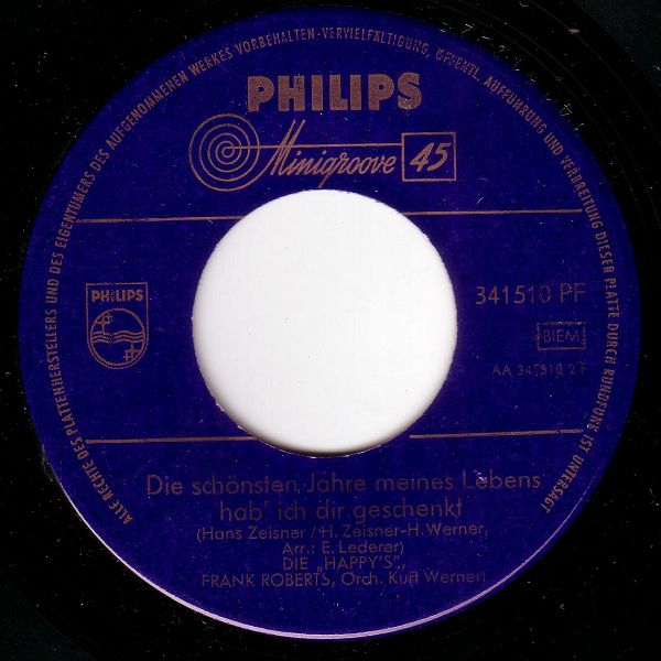 03 59....341 510 PF....DIE „HAPPY'S" Orchester Kurt Werner..Du hast umsonst geweint/DIE „HAPPY'S" FRANK ROBERTS Orch. Kurt Werner..Die schönsten Jahre meines Lebens hab' ich dir geschenkt