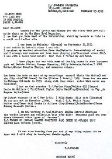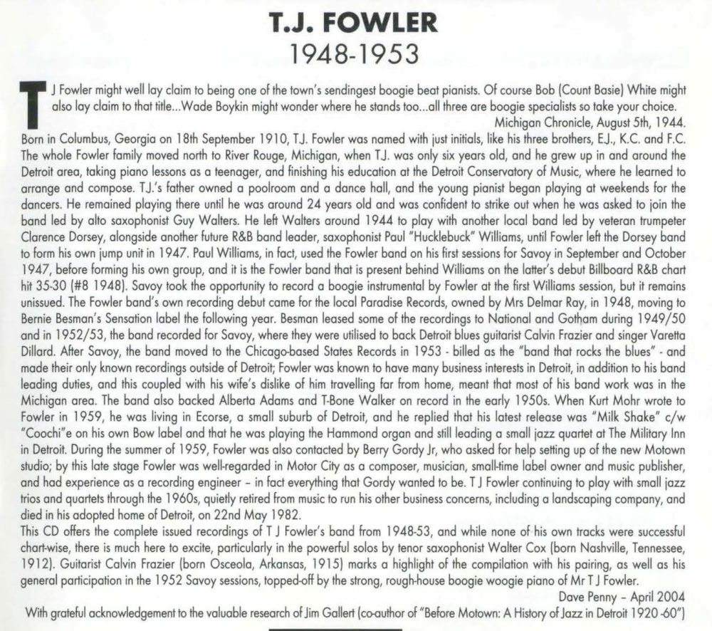 Der Jazz-Pianist, Songwriter und Bandleader T. J. Fowler wurde am 18. September 1910 in Columbus, Georgia, tatsächlich als T. J. Fowler geboren - seine drei Brüder hießen mit Vornamen E.J., K.C. and F.C., so etwas gibt es nur in den USA - und verstarb am 22 Mai 1982 in Detroit, Michigan. Etwa 1916 zog die Familie nach Detroit wo T. J. auch aufwuchs und seine musikalische Karriere begann.