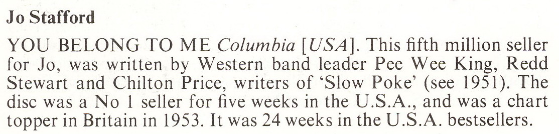 "You Belong To Me" weist als Autoren Pee Wee King, Redd Stewart und Chilton Price aus. Es wird aber glaubwürdig erzählt, dass Chilton Price den Song ganz alleine verfaßt hat und die Herren sich dann nur dazugesellt haben, aber wie auch immer.