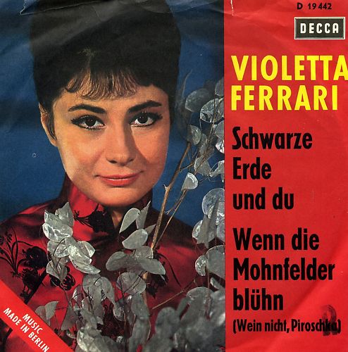 FERRARI, VIOLETTA * 25.04.1930 in Hódmezővásárhely/Ungarn, Sängerin, 1963/64 Decca (19377 "Weil Ich Dich Liebe"/"Nur Der Charly Will Mich Küssen" & ADDY FLOR und sein Orchester, 19409 "Fürs Erste Mal"/"Du Kommst Ja Wieder (Il Est A Toi Mon Coeur)" & ADDY FLOR und sein Orchester, 19442 "Schwarze Erde Und Du"/"Wenn Die Mohnfelder Blühn (Wein’ Nicht, Piroschka)" & ADDY FLOR und sein Orchester, 19542 "Wenn Ich Bei Dir Bin"/"Es Muß Die Liebe Sein"-1964 & ADDY FLOR und sein Orchester), 13.06.1964 Teilnahme an den Deutschen Schlagerfestspielen 1964 in Baden-Baden (12. Platz "Es Muß Die Liebe Sein"), 1967 Polydor 52780 ("Die Welt Ist Doch Für Alle Da"/"Einmal Möchte’ Ich Erwachen"-aus dem Musical "Millionen Für Penny" & Orchester GERD WILDEN), UFA-Label 18410 ("Piccadilly Jack"/"Nachts In Soho" & Studio-Orchester HANS CREUTZIGER), Filme: "Der Fall Judith B."-1955, Mitwirkung in der Musikkomödie "Scala-Total Verrückt"-1958, "Laß Mich Am Sonntag Nicht Allein"-1959, "Scheidungsgrund: Liebe"-1960, "Der Pastor Mit Der Jazz-Trompete"-1962, TV "Tausend Rote Rosen Blühn"-1969