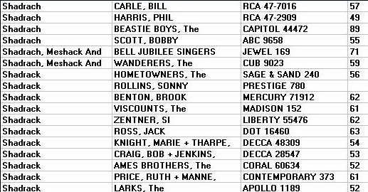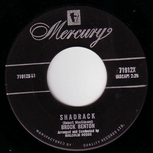 Shadrack (aka "Shadrach" or "Shadrach, Meshach and Abednego") is a popular song written by Robert MacGimsey in the 1930s and performed by Louis Armstrong and others. In 1962 the song was a hit single for Brook Benton, peaking at #19 in Billboard's Hot 100 chart during the week of February 17, 1962.