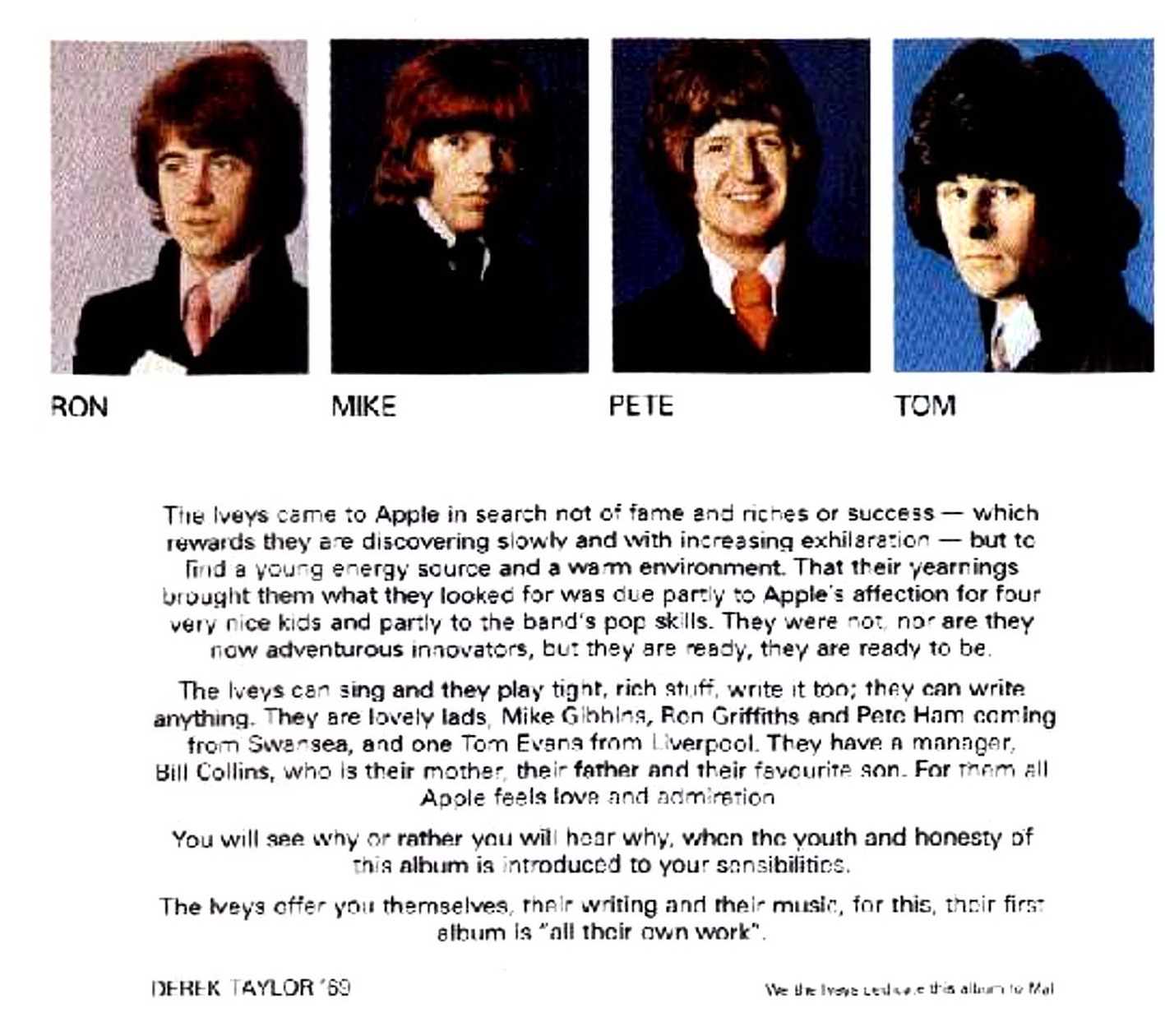 The Iveys formed in 1961 in Swansea, from The Panthers, whose lineup comprised Ham (lead guitar) (b. Peter William Ham, 27 April 1947, Townhill, Swansea, d. 23 April 1975), Griffiths (bass guitar) (b. Ronald Llewellyn Griffiths, 2 October 1946, in Swansea), Roy Anderson (drums), and David 'Dai' Jenkins (guitar), (b. David Owen Jenkins, 30 October 1945, Swansea). Playing under various names including The Black Velvets and the Wild Ones, by 1964 they settled on The Iveys, after a street in Swansea called Ivey Place. In March 1965, drummer Gibbins (b. Michael George Gibbins, 12 March 1949, Swansea, d. 4 October 2005) joined The Iveys. The group secured concerts around Swansea area, opening for prominent British groups such as the Spencer Davis Group, The Who, The Moody Blues and The Yardbirds.