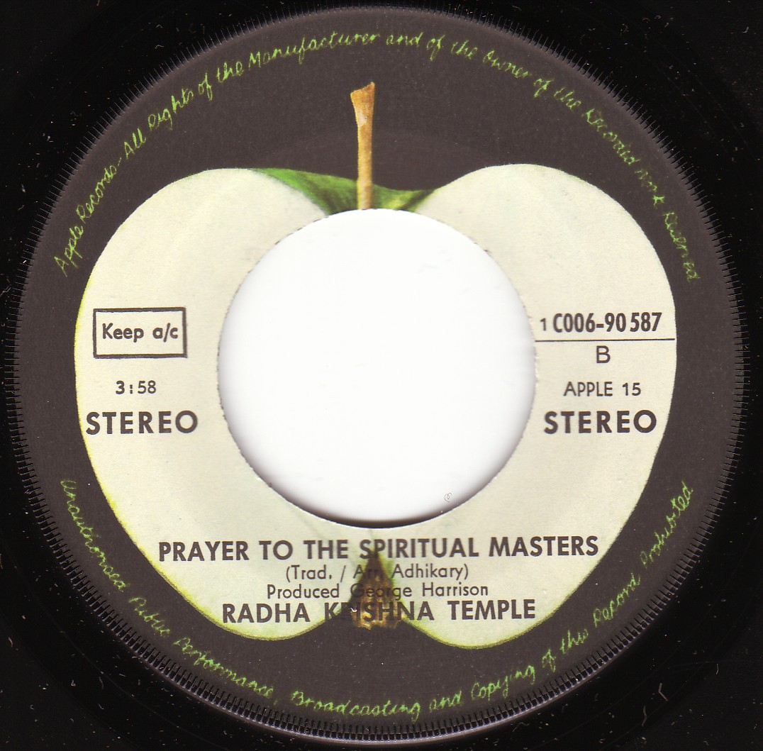 George was already aware of the devotees of Krishna before meeting the movements leader A.C Bhaktivedanta Swami Prabhupada and had purchased 20 copies of the Happening album, the first recording by Swami Prabhupada and his disciples. But it wasn’t until 1969 that George was to meet Shyamasundara dasa in the London offices of Apple Records, the Beatles’ recording company. “Where have you been? I’ve been waiting two years to meet you fella's” was how he greeted the devotee. Shyamasundara and five others had come to London to start a branch of ISKCON and they had sent apple pies and clockwork apples with the Hare Krishna mantra written on them to the Beatles at Apple. This initial meeting eventually led to the recording of 'The Hare Krishna Mantra' by the Radha-Krishna Temple with George, Paul, Linda and drummer Ginger Baker all in the studio helping. George produces the song and is believed to have played harmonium and guitar on the "Govinda" and "Hare Krishna Mantra". Harrison also attended the Radha Krsna Temple's Top of the Pops appearance when they performed the single "Govinda", although he did not appear in front of the cameras. It reached the charts in twenty countries it was even sung one afternoon by 40,000 people at Wembley.