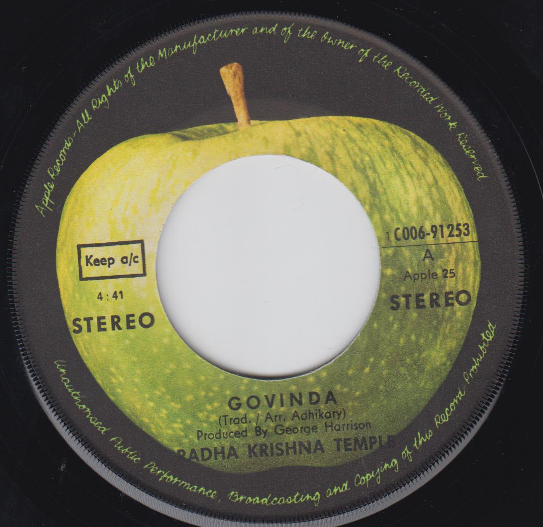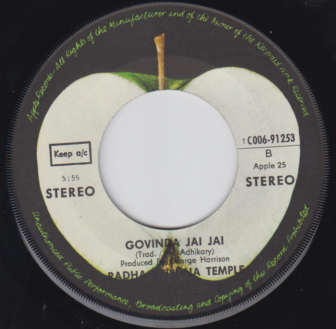 The Hare Krishna's often seen marchign up and down London's busy Oxford Street became Apple recording artists thanks to George Harrison who is a follower of the religion. This single consists of traditional mantras and prayers that the Krishna's chant, Both produced by George. Issued with a picture sleeve.
