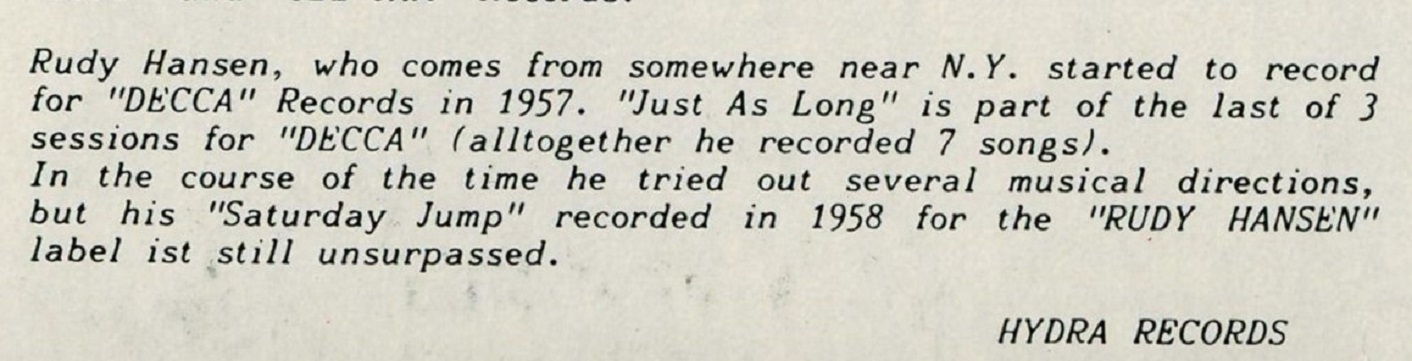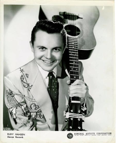 Rudy Hansen (in den USA fallweise auch als Hanson) wurde in der Stadt Wyk auf Föhr auf der zum deutschen Landkreis Nordfriesland gehörenden Insel Föhr geboren. Wann er geboren wurde, wann er in die "Staaten" kam und ob er heute noch unter uns weilt, weiß ich leider nicht. 1956 war er jedenfalls bereits fester Bestandteil von WLW's "Midwestern Hayride" in Cincinnati, Ohio.