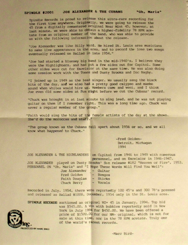 Im Verzeichnis der amerikanischen Musikervereinigung tauchte der Name Charles Berryn als Gitarrist bei den Titeln “Oh Maria“ und “I Hope These Words Will Find You Well“ auf, die als Joe Alexander and The Cubans für Ballad Records erschienen.