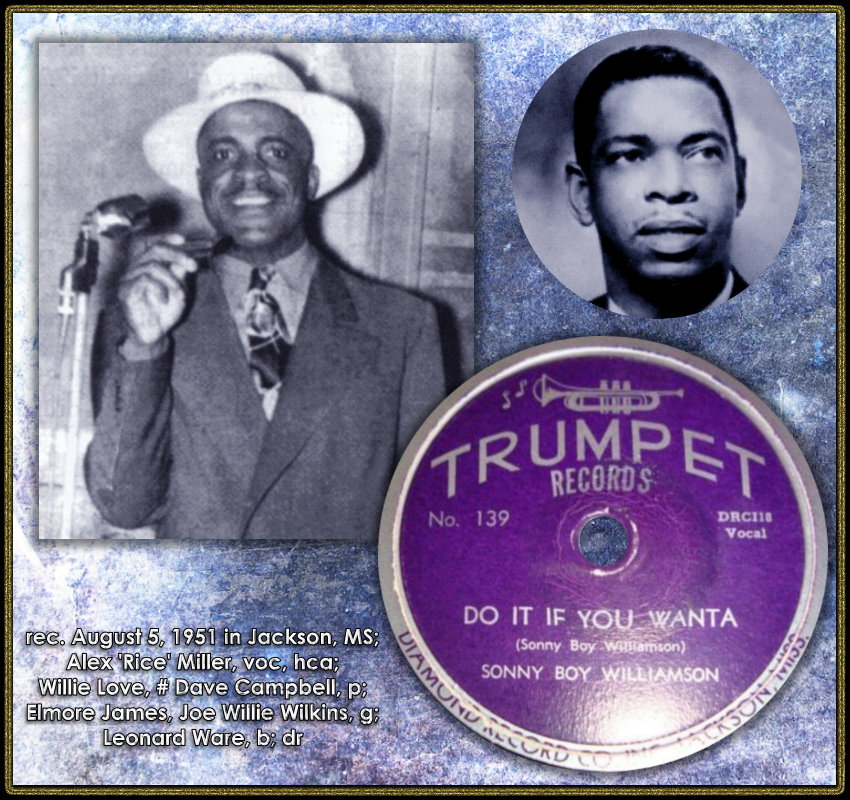 "Sonny Boy" Williamson (Aleck/Alex „Rice“ Miller), * 05. Dezember1899 auf der Sara Jones Plantation nahe Glendora/Mississippi, + 25. Mai 1965 in Helena/Arkansas, gehört zu den legendären Blues-Musikern.