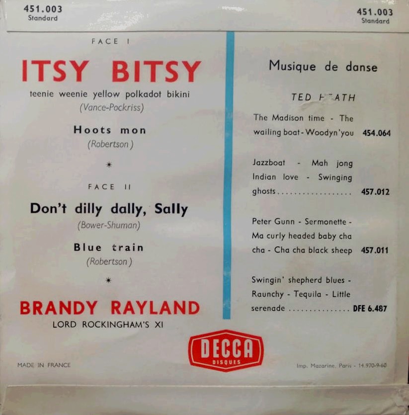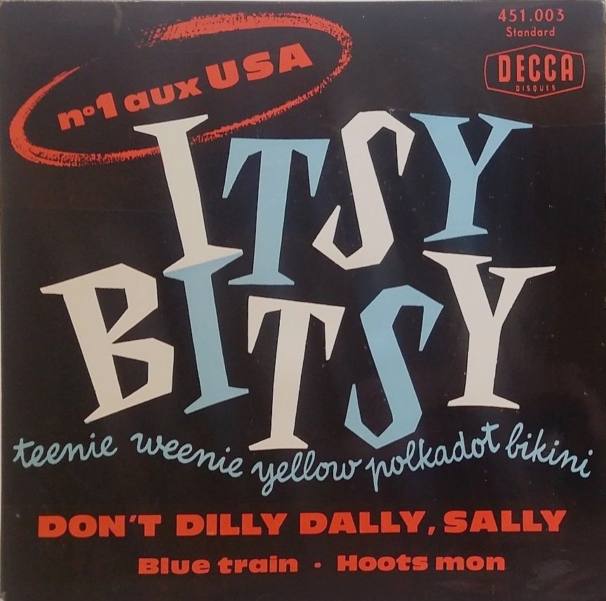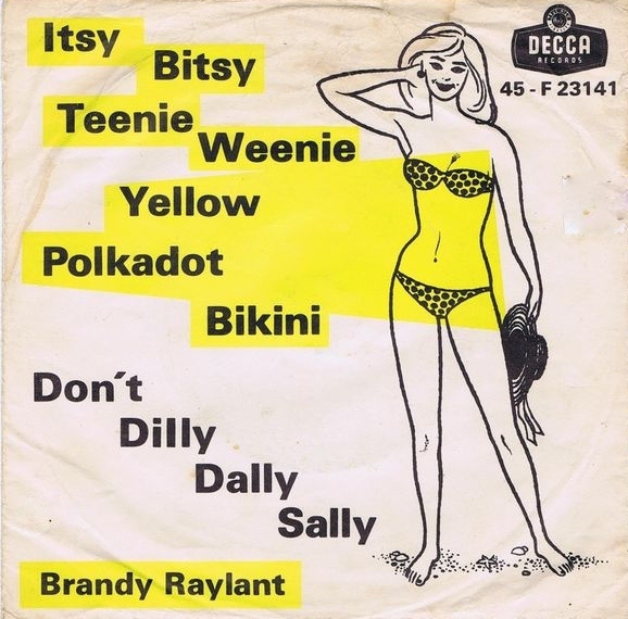Interpret ist Brandy Raylant (klingt irgendwie nach Brian Hyland), mit Itsy Bitsy Teenie Weenie Honolulu Strand-Bikini / Don´t dilly dally Sally. Starlet Single 45-1687.