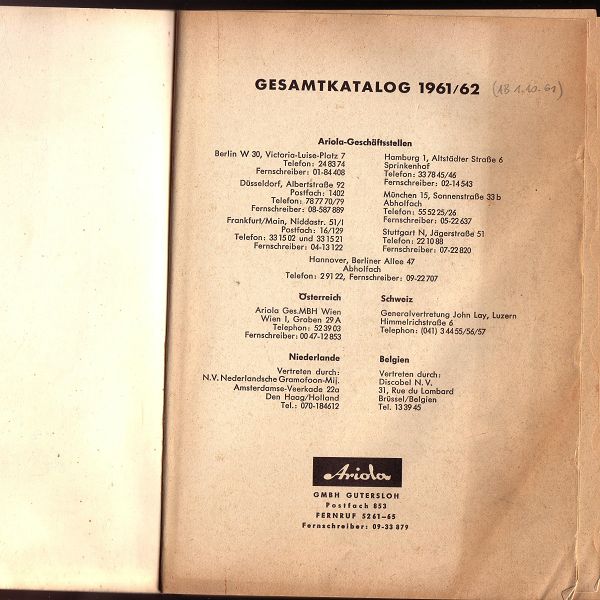 Mein Gesamtverzeichnis 1961/62 hat auf Seite 1 die deutsche Adresse, hat aber zusätzlich sämtliche Geschäftsstellen und Auslandsvertretungen etc. angeführt. Der Hinweis auf Seite 7 was wo erhältlich ist oder nicht, ist bereits viel differenzierter.