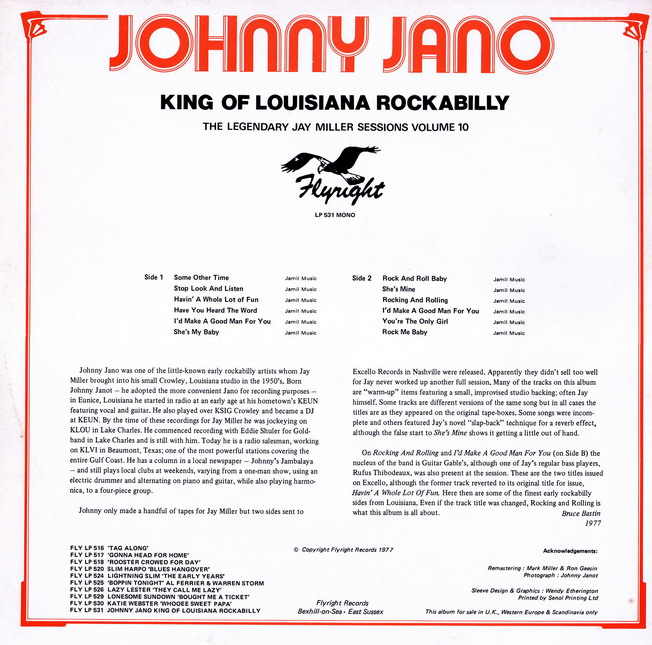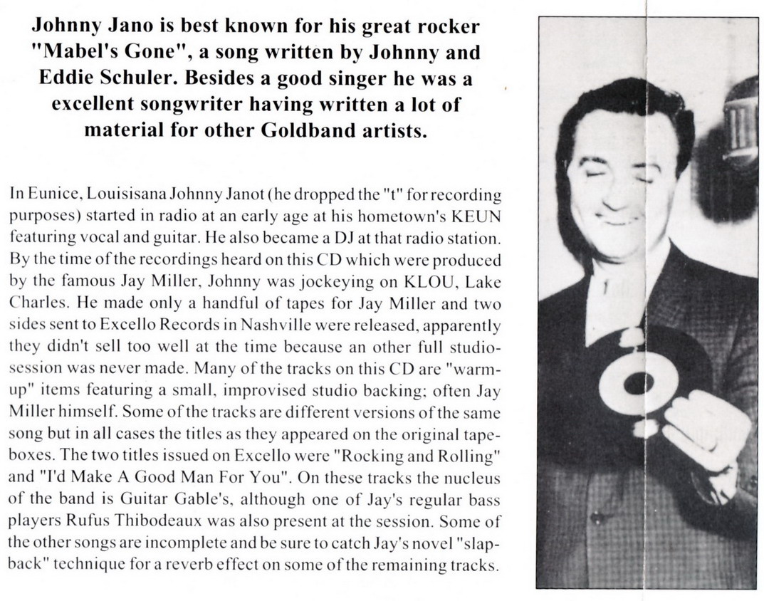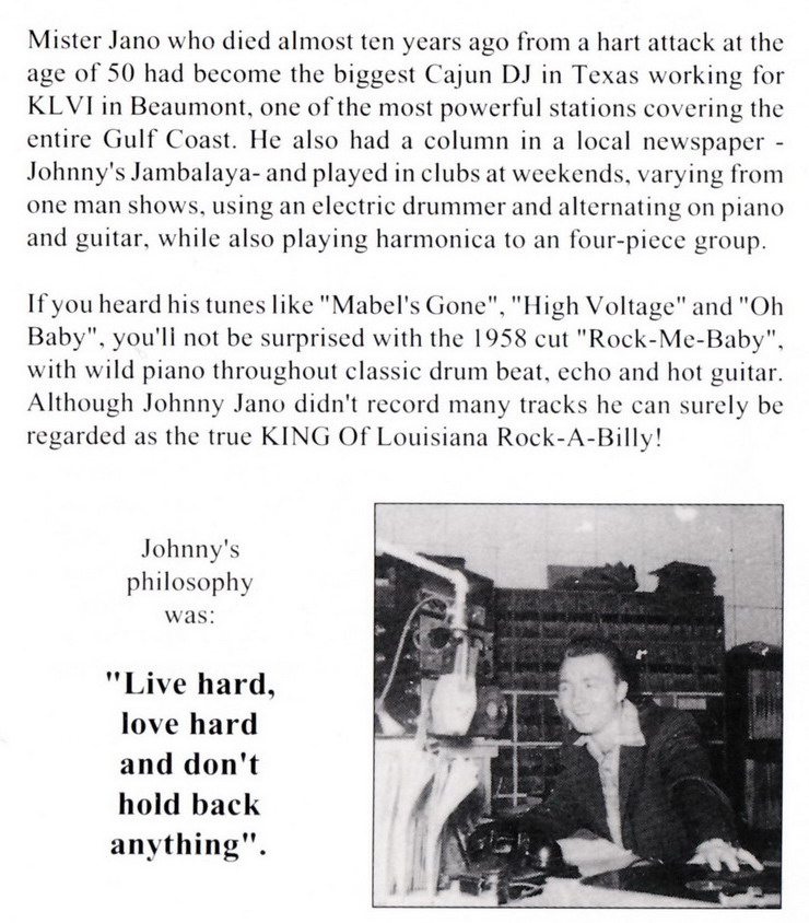 Der Rockabilly-Sänger und Gitarrist Johnny Jano wurde am 14. September 1933 in Eunice, Louisiana, als John Remie Janot geboren und verstarb am 16. Jänner 1984 in Beaumont, Texas, erst 50-jährig an einer Herz-Attacke.