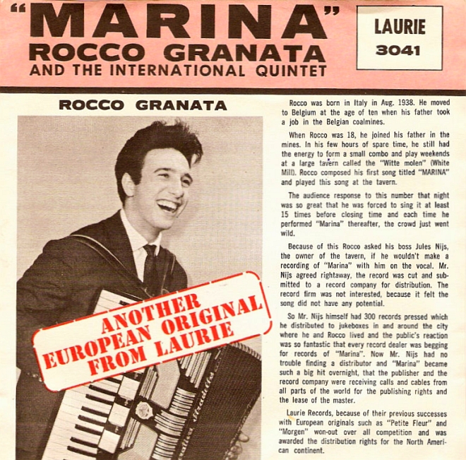 Der Musiker, Autor und Sänger Rocco Granata wurde am 16. August 1938 in Figline Vegliaturo in der italienischen Region Kalabrien geboren. Als Rocco 10 Jahre alt war zog die Familie aus dem Mezziogiorno, den wirtschaftlich am wenigst entwickelten Teil Italiens, nach Genk ins belgische Kohlerevier, um sich einen besseren Lebensstandard zu verschaffen. Rocco erlebte daher seine Teenagerzeit bereits in Belgien. Wie sein Vater arbeitete er vorerst auch in den Kohlenminen was ihn weniger behagte. Viel lieber sang er und spielte er mit seinem Akkordeon was in veranlaßte eine Band The International Quintet zu gründen und als Musiker sein Geld zu verdienen. Er schrieb sich auch die Lieder selbst und ging mit Demo-Aufnahmen bei den diversen Plattenfirmen hausieren, was ihm aber kaum Erfolg brachte. Er entschloß sich daher, eine Platte mit den Titeln "Manuela" und "Marina" bei TONALTY in Antwerpen selbst zu produzieren und an die DJs zu verteilen und sein eigentlich als B-Seite konzipiertes "Marina" machte die Platten-Bosse endlich hellhörig. Der Vertrieb für die Single wurde von MOONGLOW übernommen und erreichte Platz eins in den belgischen Charts. Die weiteren Veröffentlichungen erfolgten auf dem MOONGLOW-Label. Die enge Zusammenarbeit mit der deutschen ELECTROLA hatte dann auch eine ganze Reihe von deutschsprachigen Produktionen zur Folge.
