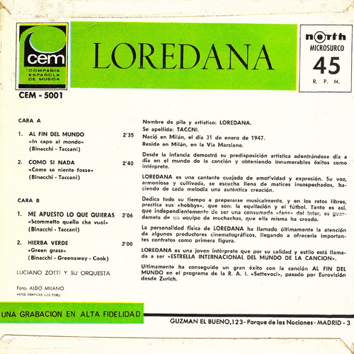 Die italienische Sängerin Loredana wurde 1943 als Tochter des bekannten Schlagerkomponisten Alessandro Taccani ("Come prima", Chella lla'" etc.) in Mailand geboren.