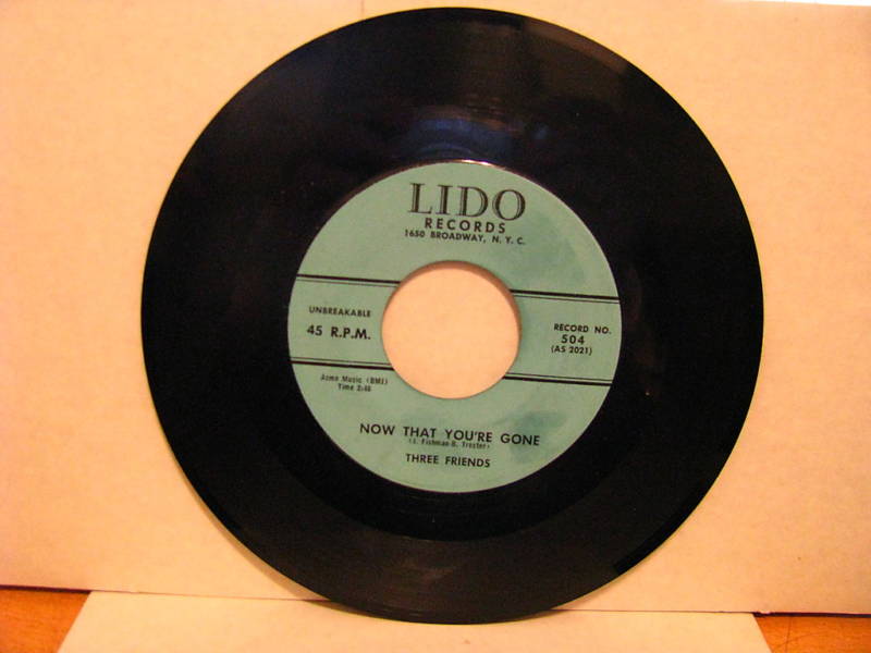 Riding high on the success of "Blanche" the Three Friends took almost a year to release some follow up discs. The first, issued as Lido 502 in October 1957 was "I'm Only A Boy (To Her)", a teen coming of age ballad backed with "Jinx" a mid tempo pop number. Lido 504 was also released about the same time with a pairing of two ballads "Now That You're Gone" covered with "Chinese Tea Room". The groups polished pop sound may have been too "adult" sounding for teen audiences and the records failed to chart. Brunswick reissued "Jinx" paired with "Chinese Tea Room" in 1957 but didn't fare much better than Lido with the tunes.
