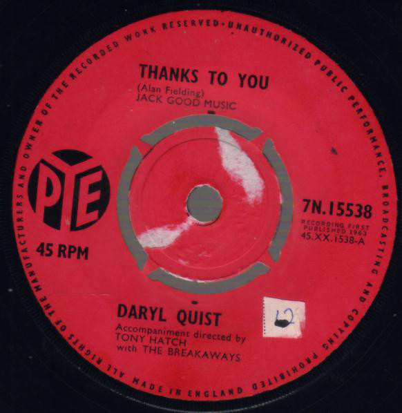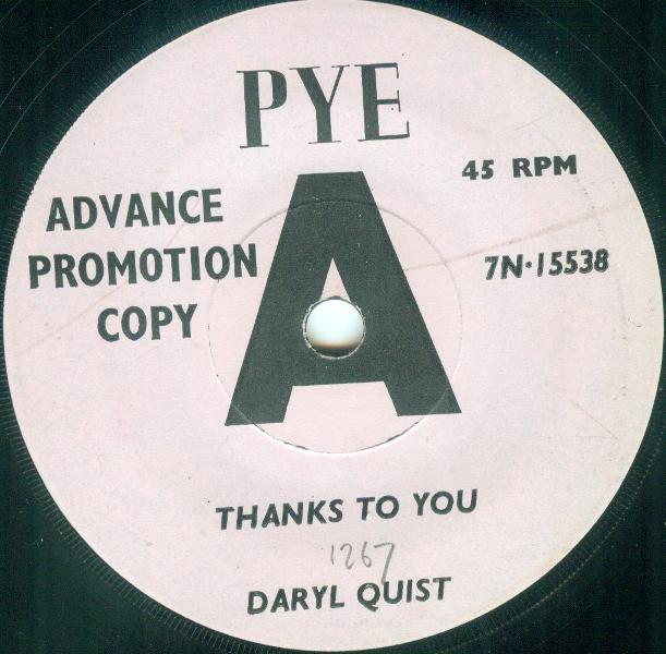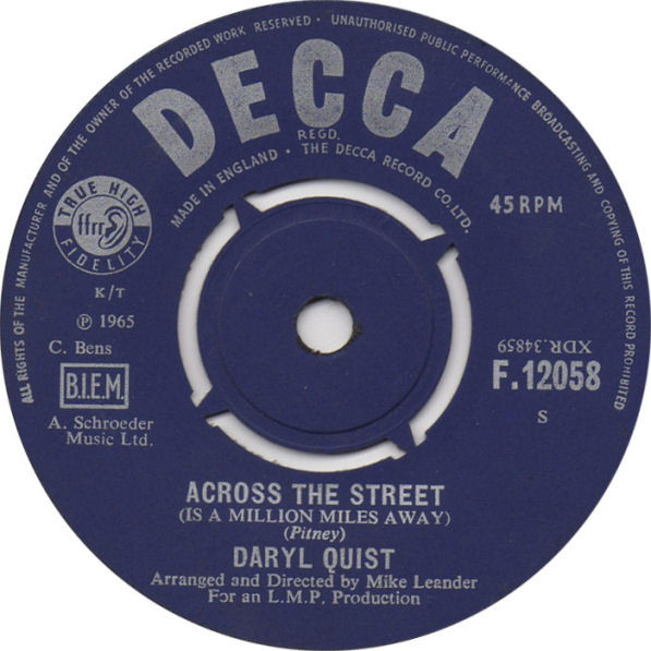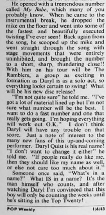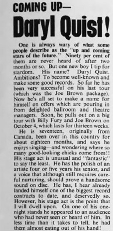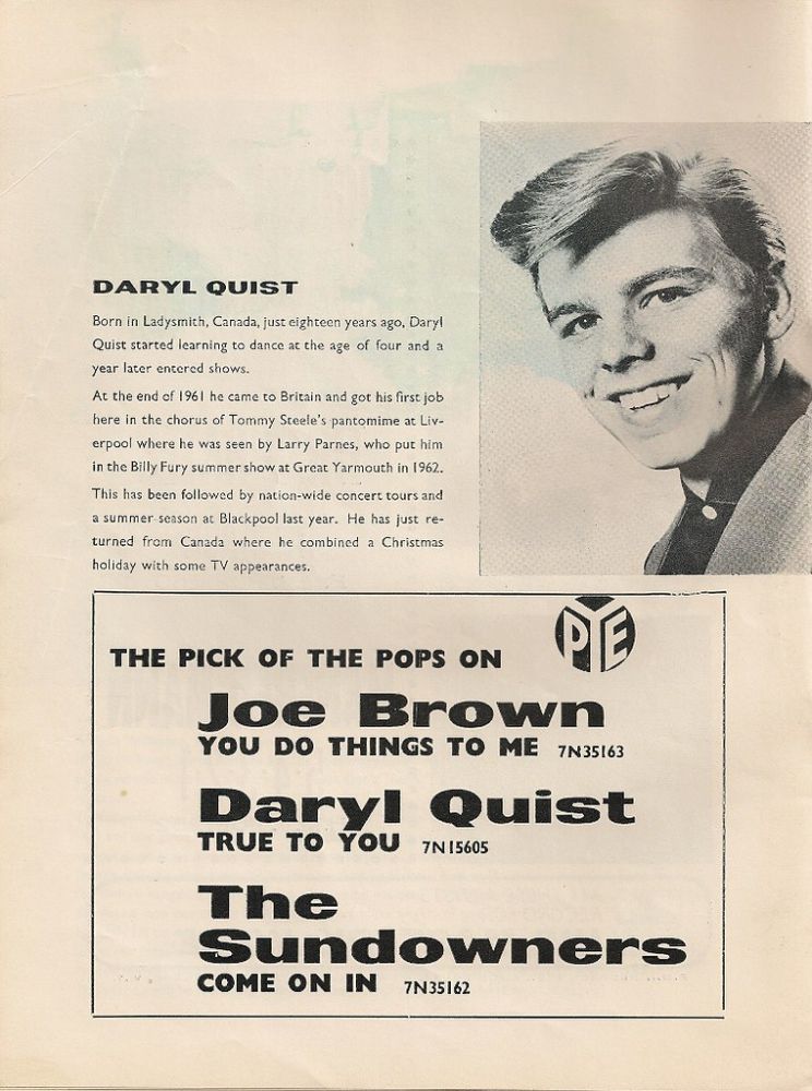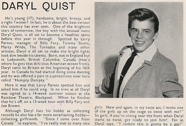 über Daryl Quist ist mir wenig bekannt, außer dass er in Kanada geboren wurde, 1961 nach England ging und dort bei Larry Parnes unter Vertrag war. Seine ersten beiden Singles zähle ich unbedingt zum britischen Rock 'n Roll: