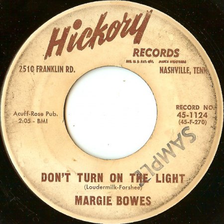 Bowes signed with Hickory Records and released her first single in 1958, "Won'cha Come Back to Me" backed with "One Broken Heart". The singles gained some attention, but failed to chart. Her next two-sided single, "One Time Too Many"/"Violets and Cheap Perfume" also failed to chart, but she made her debut on the Grand Ole Opry later that year. In 1959, she released her third single, "Poor Old Heartsick Me". The song proved very successful for Bowes, and it just made the country top 10 that year. "Poor Old Heartsick Me" remained her signature tune.