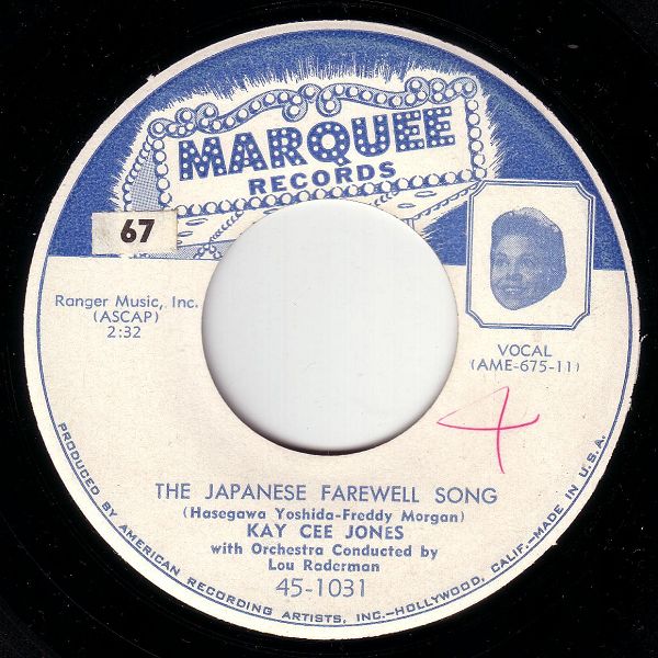 10 55....45-1031....KAY CEE JONES with Orchestra Conducted by Lou Raderman..The Japanese Farewell Song (AME 675 11)/I Wore Dark Glasses (At Your Wedding) (AME 676 4) (MARQUEE 1031)