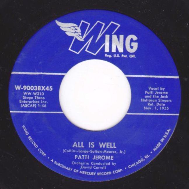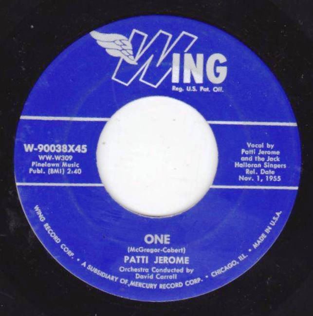 Patti found her way to Wing Records in the late summer of ’55. Wing was a subsidiary label of Mercury, based out of Chicago. The Pinelawn Music Publishing arm gave Patti the Dion McGregor/Robert Cobert composition “One” to record, along with another tune titled “All Is Well.” Patti was backed vocally on these sides by the Jack Halloran Singers, who sang behind Johnny Cash and gospel singer Mahalia Jackson, and would later sing behind Ray Charles. The orchestra was conducted by David Carroll, and the single was released in November of 1955. Patti got some bookings at night clubs and other formal occasions with the moderate success of this single.