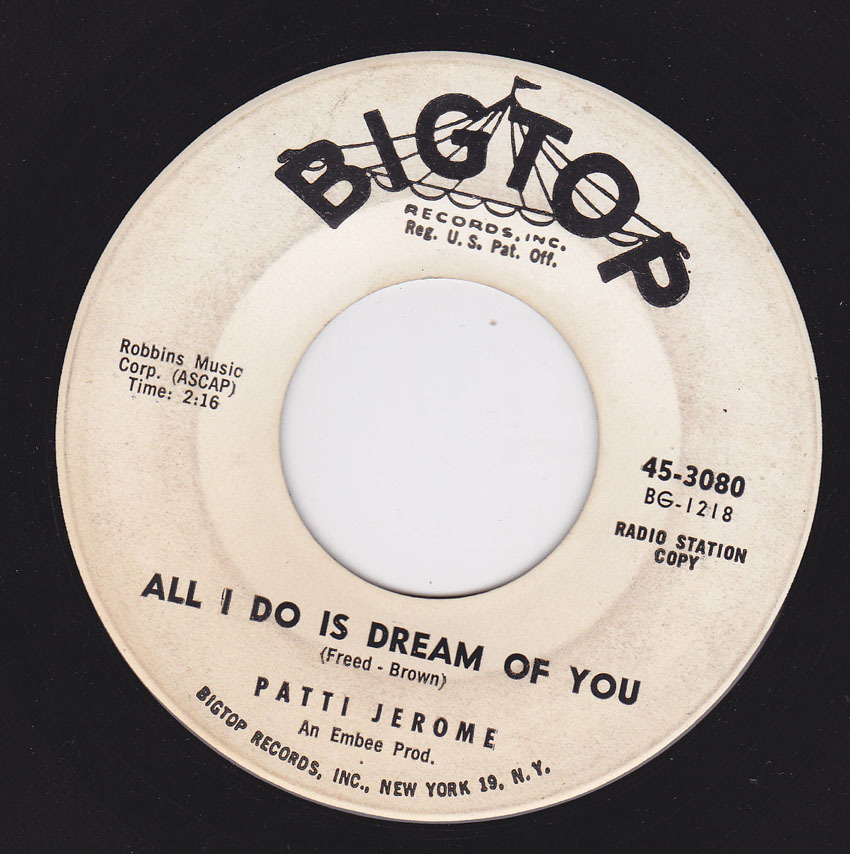 In late 1956, Jerome signed on to George Goldner’s Rama label in New York City. With the Bob Armstrong Orchestra, she recorded “My Doggie Wag His Tail” and “Just As I Am,” released on Rama #219 in the early spring of 1957. Goldner and partner Joe Kolsky had hired Morris Levy as president of their major label, Roulette. On April 6, 1957, it was announced in Billboard Magazine that “Goldner has sold his interests in the Roulette, Rama, Gee, and Tico labels outright to Morris Levy.” Levy owned several nightclubs in mid-town Manhattan, was known to associate with the Mafia, was in business with deejay Alan Freed (who was involved in the Payola scandals) and, with Freed, helped to promote the hugely successful Rock ‘n Roll Shows at the Brooklyn Paramount Theater. Levy accumulated a vast fortune from publishing copyrights. Patti, as did other artists on the label, got some gigs singing at Morris Levy’s nightclubs around Manhattan to stay working.