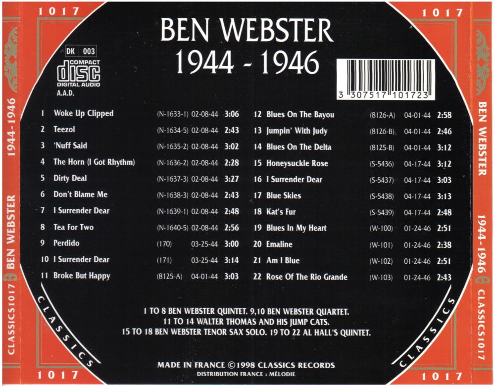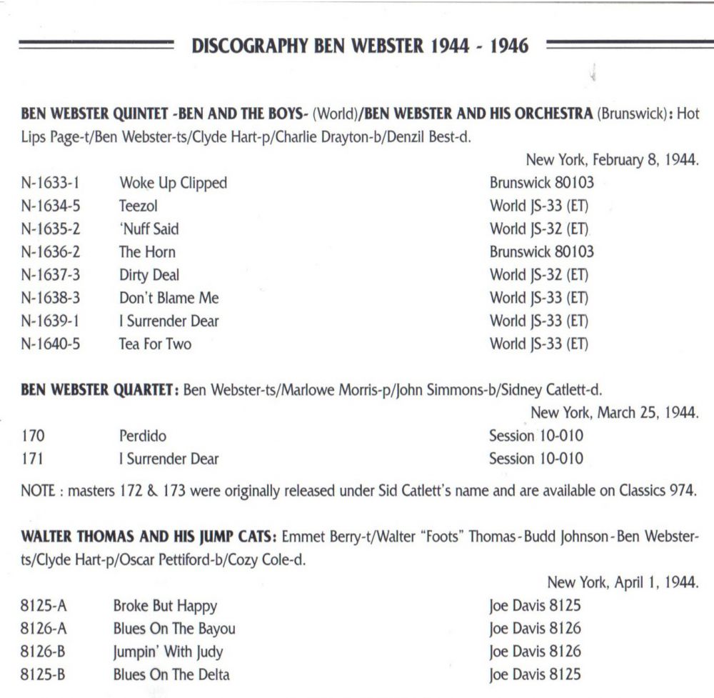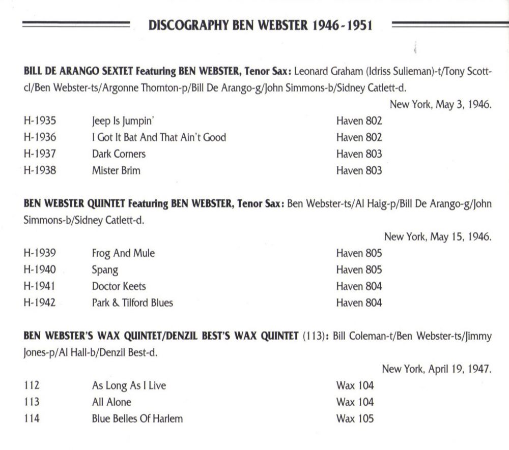 Benjamin Francis Webster (* 27. März 1909, + 20. September 1973) war ein US-amerikanischer Jazz-Tenorsaxophonist. Er stammt aus Kansas City/Missouri. Er studierte Violine, lernte Blues auf dem Klavier von Pete Johnson und erhielt Saxophonunterricht von Budd Johnson. Er spielte mit Lester Young in der Young Family Band. Er nahm mit Blanche Calloway auf und wurde Mitglied des Bennie Moten Orchestra mit Count Basie, Hot Lips Page und Walter Page. In den 1930 er Jahren spielte er in Bands unter der Leitung von Willie Bryant, Benny Carter, Cab Calloway, Fletcher Henderson, Andy Kirk und Teddy Wilson.