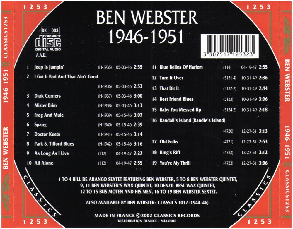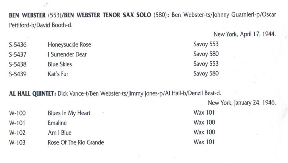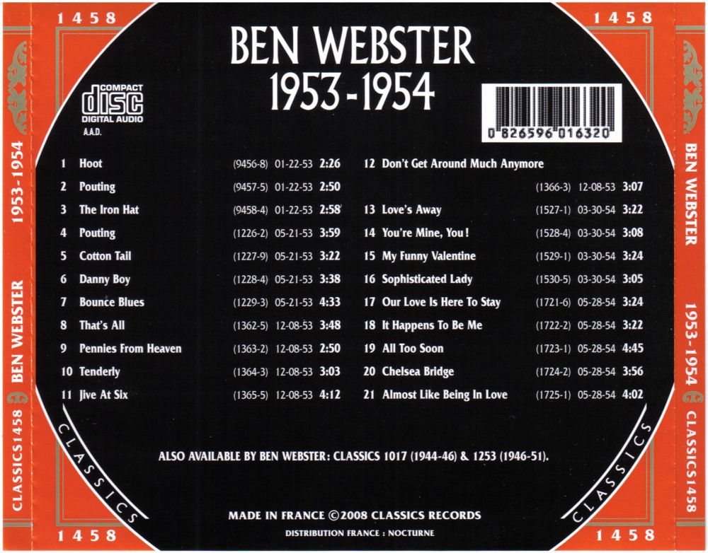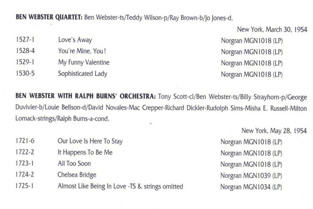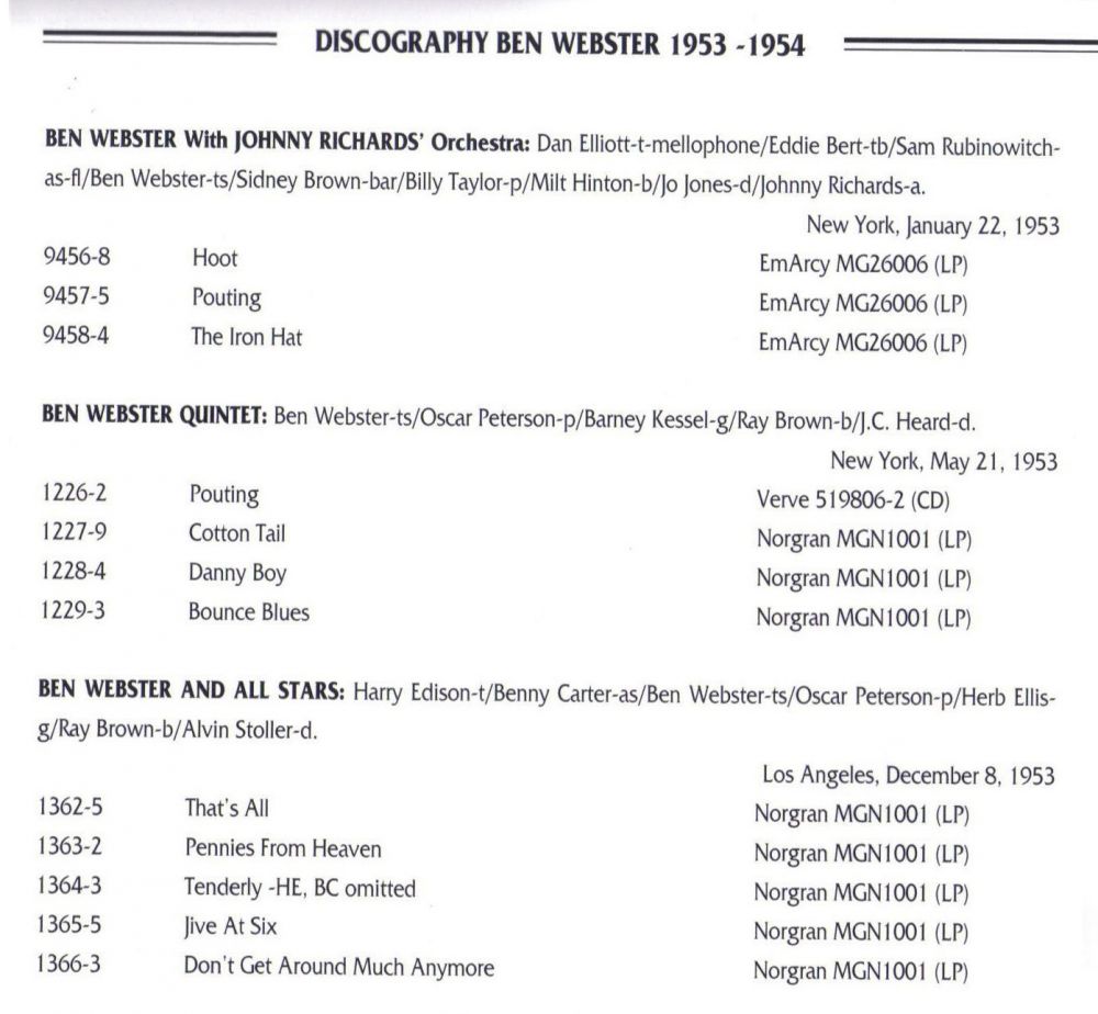 1953 nahm er “The Consummate Artistry of Ben Webster“ (heute bekannt als “King of the Tenors“) mit dem Pianisten Oscar Peterson auf, der im Laufe des Jahrzehnts ein wichtiger Mitarbeiter von Webster bei dessen Aufnahmen für die verschiedenen Labels von Norman Granz sein sollte. Zusammen mit Peterson, dem Trompeter Harry „Sweets“ Edison und anderen tourte und nahm er mit “Granz‘ Jazz at the Philharmonic-Paket“ auf.