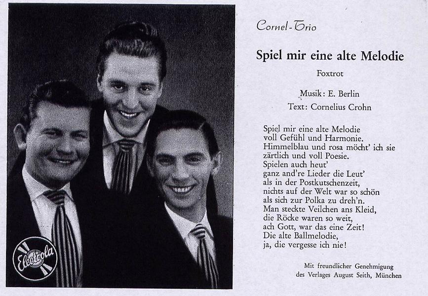 seit Januar 1949 als CORNEL-TRIO auf Amiga (u.a. "Die Rose Vom Wörthersee", "Geisterreiter" & RITA PAUL, "Gepfiffen Klingt’s So" & ILJA GLUSGAL, "Sing, Nachtigall, Sing", "Wochenend Und Sonnenschein" & HEINRICH RIETHMÜLLER-org, "Mach's So Wie Ich Und Pfeif Ein Lied"-1950, "Fahr'n Sie Nicht Zum Nordpol"-1951, "Der Verliebte Jazztrompeter"-1953, "Bravo, Bravo, Beinah' Wie Caruso"-1953, "Holzhacker-Dixie"-1954), CORONELS, CORNEL-QUINTETT,