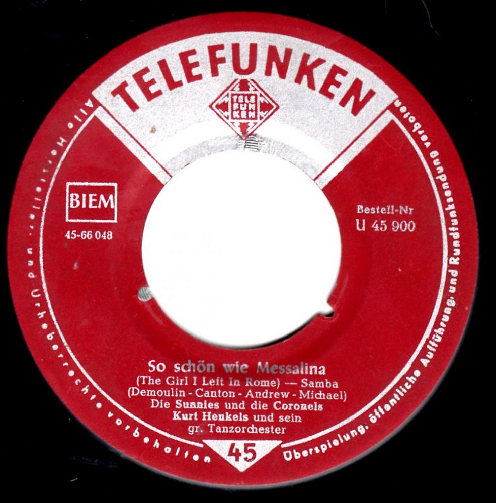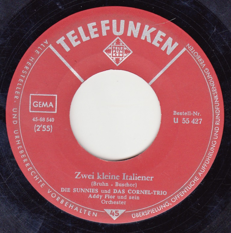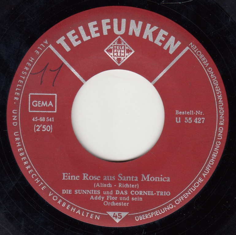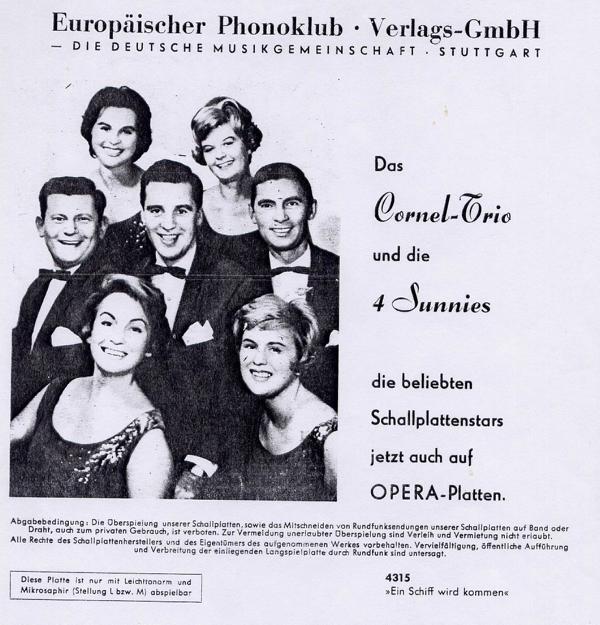 SUNNIES und Das CORNEL-TRIO, Die, Gesangensemble, ab Frühjahr 1955 hatten die Produktionen der Telefunken u. Decca die ideale Gesangformation gefunden (u.a. 55170 "Das Klima Von Lima"/"Einen Sonntag Voller Liebe"-1959), Ariola, 1963 Background-Gesang bei den Deutschen Schlagerfestspielen, 1967 Auftaktsendung zum Deutschen Farbfernsehen (INA BELLÉ, RENI KAMBERG, MARIA KORN, MICHAEL LENGAUER, PETER CORNEHLSEN u. ALFRED LOHMANN), TV "Wir Machen Musik-Eine Show mit dem Orchester Edmundo Ros, London"