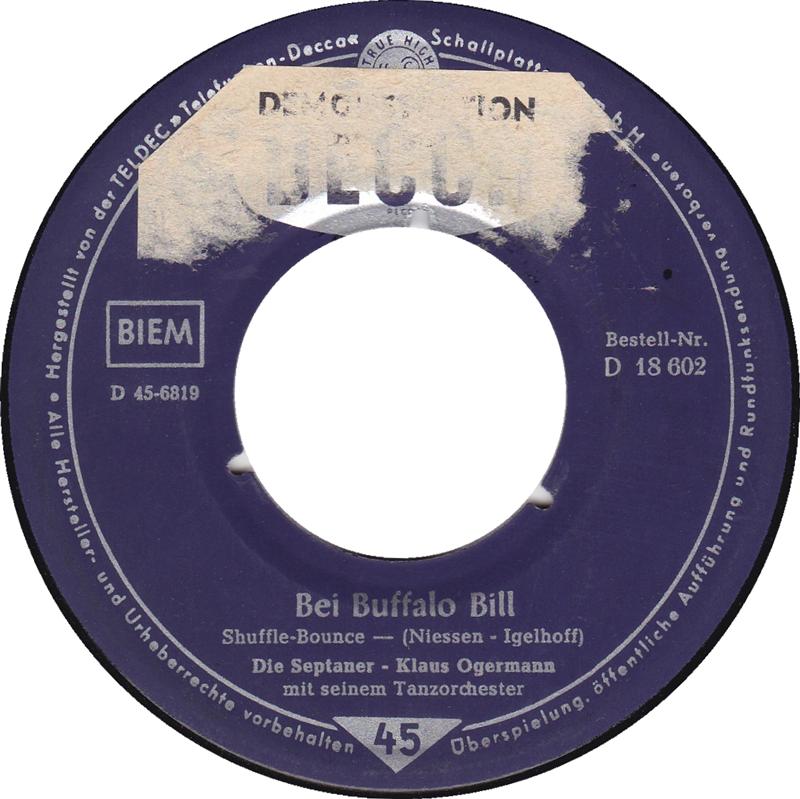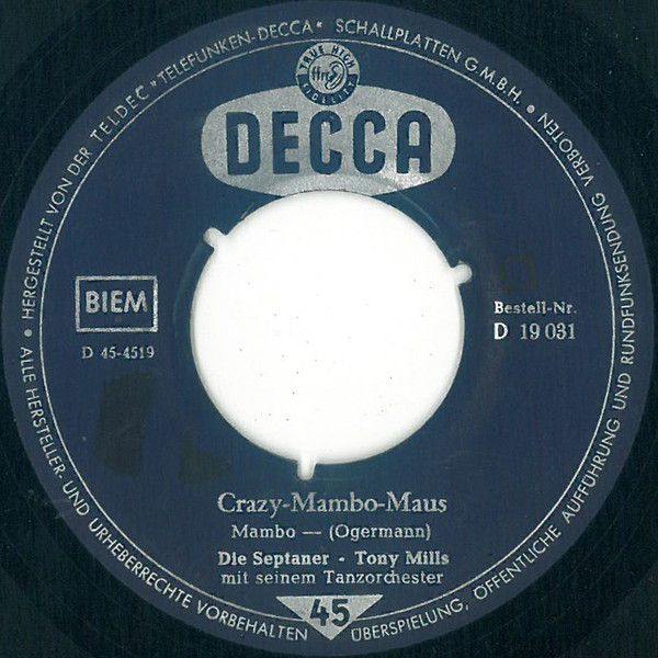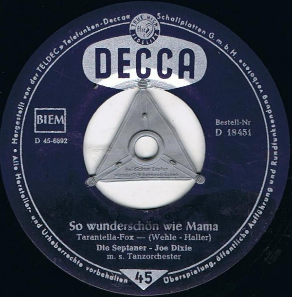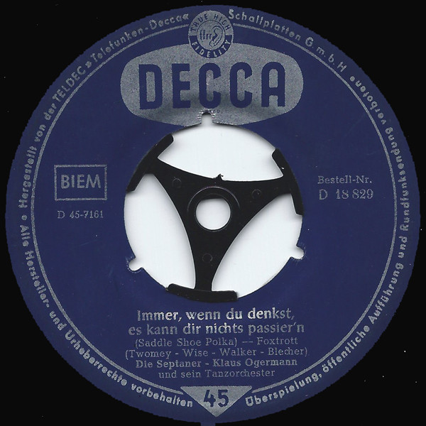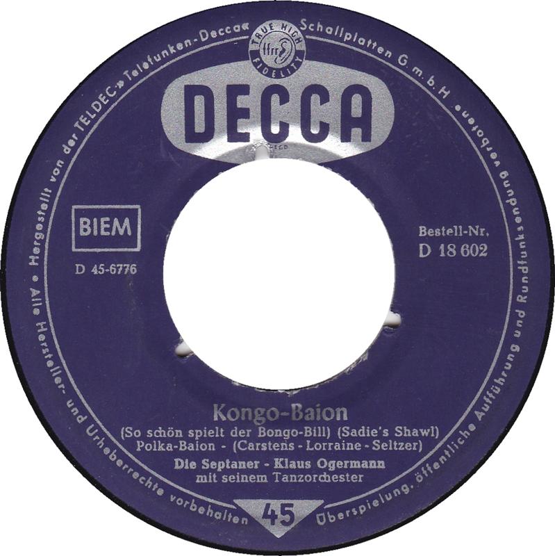 SEPTANER, Die (Die SUNNIES u. Das CORNEL-TRIO = siebenköpfige Gesanggruppe), Gesangensemble, 1957-59 Decca-Pseudonym verwandt bei Orchesteraufnahmen mit KLAUS OGERMANN u. WILLY MATTES/CHARLES WILDMAN (46451/18451 "So Wunderschön Wie Mama"/"Jan, Spiel Uns Irgendwas"-1957 & JOE DIXIE mit seinem Tanzorchester, 46519/18519 "Sag’n Sie, Hab’n Sie Heute Zeit"/"So Süß Wie Spanischer Wein" & GERT FITZ & Orchester WILLY MATTES, 46585/18585 "Die Tanzmusik Ist Schuld Daran"/"Hände Weg Von Der Liebe" & KLAUS OGERMANN und Die Swing-Serenaders, 18598 "Das Wissen Alle Leute"/"Heut Oder Nie" & GERT FITZ & Orchester CHARLES WILDMAN, 18668 "Du Sagst „Vielleicht“"/"Verliebte Leute (Wollen Bummeln Gehen)", 18782 "Ciao-Ciao (Tscha-O, Tscha-O)"/"Nannina (Nanni)" & GERT FITZ & Orchester CHARLES WILDMAN, 18787 "Was Fängt Ein Junger Mann Mit Einem Mädel An?" & KLAUS OGERMANN mit seinem Tanzorchester/"Keine Angst Vor Der Liebe"-1958 & CHARLES WILDMAN mit seinem Tanzorchester, 18828 "Links-Rechts (Left Right Out Of Your Heart)" & HANNELORE CREMER & KLAUS OGERMANN mit seinem Tanzorchester/"Immer, Wenn Du Denkst, Es Kann Dir Nichts Passier’n" & KLAUS OGERMANN mit seinem Tanzorchester, 18... "Kongo-Baion (So Schön Spielt Der Bongo-Bill)"/"Bei Buffalo Bill" & KLAUS OGERMANN mit seinem Tanzorchester, 18845 "Weil Du Schöner Als Die Andern Bist" & GERT FITZ & KLAUS OGERMANN mit seinem Tanzorchester /"Hände Hoch-Ich Schieße" & KLAUS OGERMANN mit seinem Tanzorchester, 19031 "Benny’s Doodlin’ Band (A Doodlin’ Song)"/"Crazy-Mambo-Maus"-1960 & TONY MILLS und seinem Orchester), 1958 Telefunken (55026 "Wenn Es Mai Wird Am La Plata"/"Das Schiff Der Liebe Findet Immer Einen Hafen" & Das Orchester WILLY MATTES, 55048 "Die Sonne Von Venezuela"/"Leise Rauscht Das Meer" & KLAUS OGERMANN und sein Orchester, 55078"Trompeten-Benny"/"Ich Suche Einen Parkplatz" & WILLY MATTES und sein Tanzorchester)