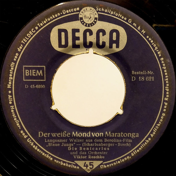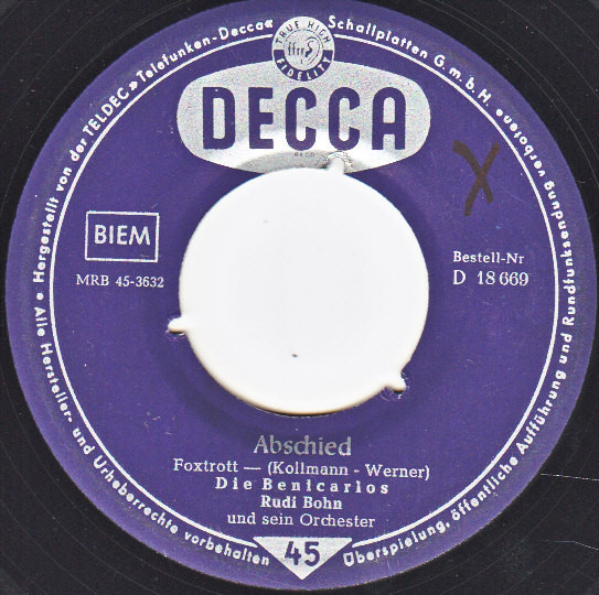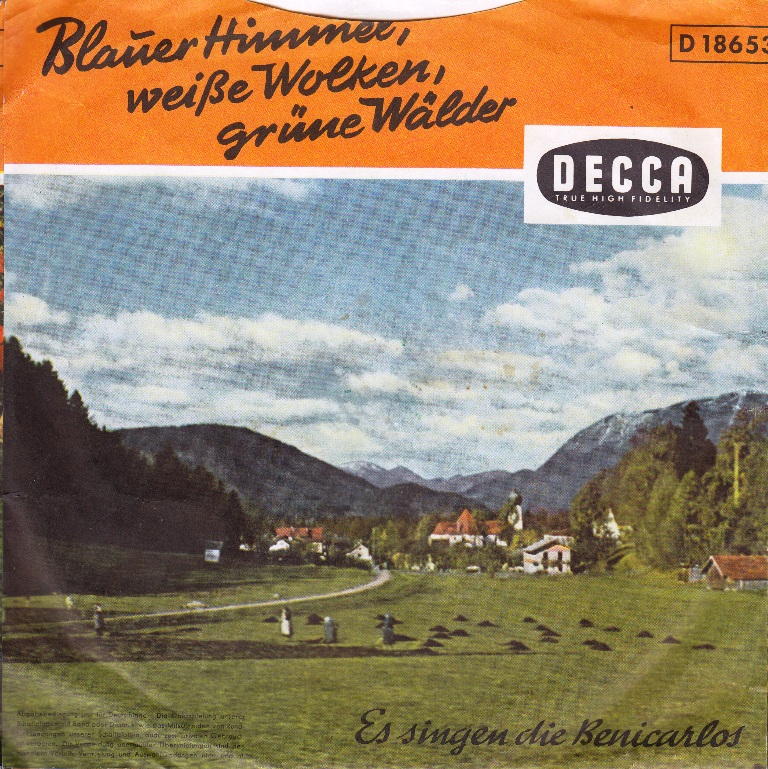 BENICARLOS, Die (u.a. CORNEL-TRIO, ROLF SIMSON), Gesangsensemble, Telefunken (u.a. 45923 "Cindy, Oh Cindy"/"Valentino"-1957 & GITTA LIND, 55077 "Der Beste Kamerad (Forbidden Love)"/"Weit Ist Der Weg (Somebody Else Is Taking My Place)"-1958, 55094 "Bis Morgen, Bis Morgen (Tomorrow, Tomorrow)"/"Lorilu (Ein Stern Hat Mich Begleitet)"-1958, 55125 "Blue Hawaii"/"Soerabaya-Joe"-1959 & BERT VARELL, 55141 "Ein Schiff Fährt In Die Ferne (No Other Arms)"/"Weißt Du, Wo Die Liebe Wohnt"-1959, 55153 "Da, Wo Der Südwind Wohnt"/"Wenn Dich Alle Vergessen" & BERT VARELL, 55180 "Immer Nur Du"/"Wenn Du Vorbeigehst" & BERT VARELL & WILLY BERKING mit seinem Orchester, 55184 "Bei Rotem Wein"/"Sehnsucht Nach Der Ferne"-1959) u. Decca (u.a. 18455 "Giddy-Giddy-Hop"/"Florero"-1957, 18456 "Einsam Und Verlassen"/"Die Schönsten Rosen" & ROLF SIMSON, 18461 "Die Nina, Die Pinta, Die Santa Maria"/"Tschio-Mio", 18621 "Der Weiße Mond Von Maratonga"-1958 & Orchester VIKTOR RESCHKE, 18653 "Blauer Himmel, Weiße Wolken, Grüne Wälder", 18669 "Abschied"/"Oleander Und Dunkle Zypressen", 18737 "Irgendwo Im Fernen Java"-1958 & HUGO STRASSER u.s. Orchester, 18746 "Im Wald, Wo Die Dunklen Tannen Stehen"-1958 & HUGO STRASSER u.s. Orchester, 18751 "Oh, Marcellina"/"In Einer Hafenbar"-1958 & JO ROLAND & RUDI BOHN u.s. Orchester, 18772 "Wo Ist Meine Susi (A Wonderful Time Up There)"/"Conchita (Don’t Rush Me)"-1958 & ROLF SIMSON, 18793 "Wunderbares Mädchen (Catch A Falling Star)"/"Bambina (Nel Blu Dipinto Di Blu)" & JO ROLAND, 18794 "Angelina, Du Bist Mein (There’s Only One Of You)"/"... In Deine Hand (He’s Got The Whole World In His Hand)" & RICA DÉUS & JO ROLAND, 18795 "La-La-La, In Ganz Valencia (Lazy Mary)"/"Oh Judy (Oh Julie)"-1958 & ROLF SIMSON, 18828 "Hannelore"/"Wer Die Sehnsucht Kennt" & VIKTOR RESCHKE u.s. Orchester, 18879 "Du Mußt Alle Wege Geh’n"/"Die Nacht Von Santa Maria (The Stars)"-1959 & BOBBY FRANCO)