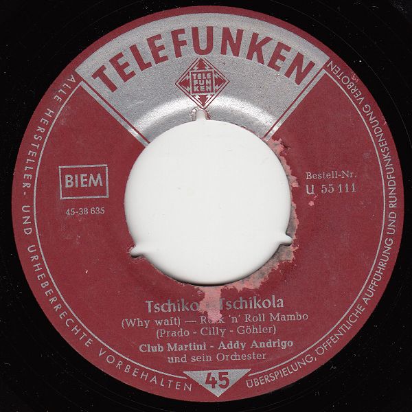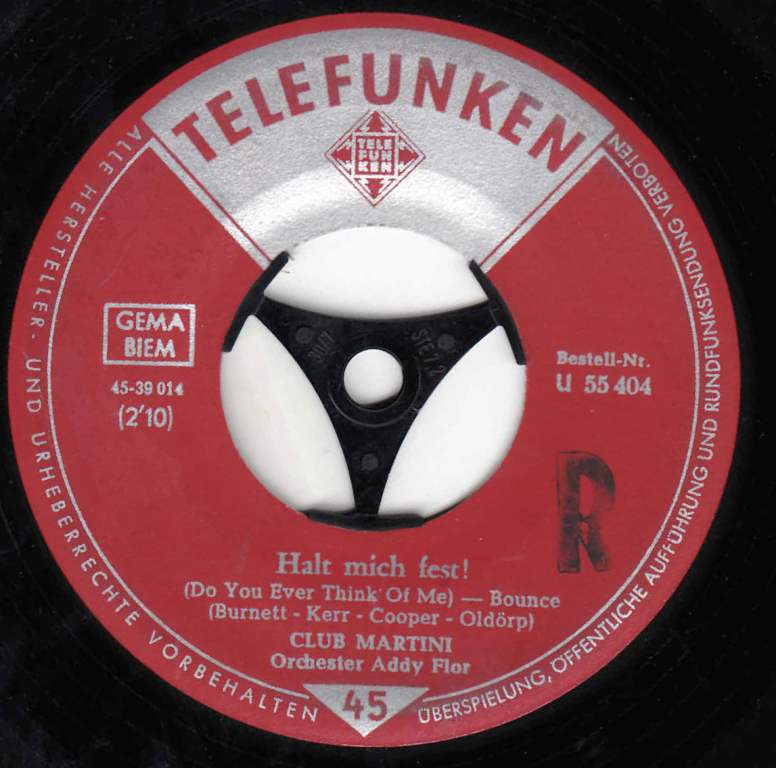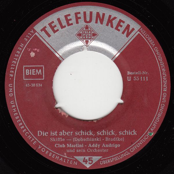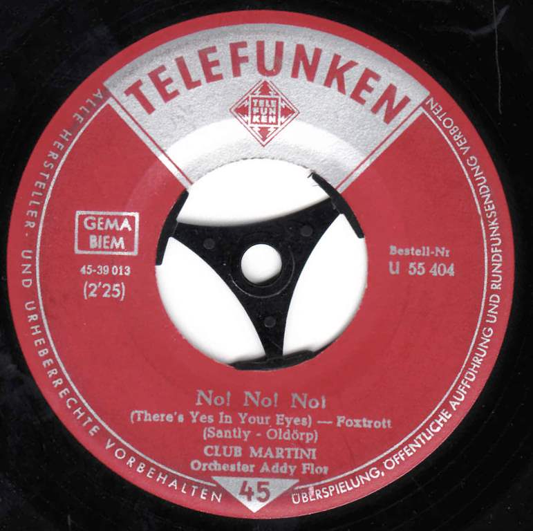 CLUB MARTINI (sehr wahrscheinlich CORNELS und SUNNIES, nicht eine der Valente-Gruppen!!!!), Gesangensemble, jeweils begleitet von ADDY ANDRIGO und seinem Orchester, 1958/59 Telefunken (U 55092 "Vamos A Cielo, Wir Seh’n Uns Wieder"/"Wenn Du Mich Küßt, Dann Höre Ich Musik"& ADDY ANDRIGO (= Arno Flohr) und sein Orchester, U 55111 "Das Ist Aber Schick, Schick, Schick"/"Tschiko, Tschiko (Why Wait)"-1958 & ADDY ANDRIGO und sein Orchester, U 55120 "Der Südwind Weht (Oh Gino, Gino, Gino)"/"Tukiwai (Lotus Love)"-1959 & ADDY ANDRIGO und sein Orchester, 55404 "No! No! No! (There’s Yes In Your Eyes)"/"Halt Mich Fest! (Do You Ever Think Of Me)" & Orchester ADDY FLOR)