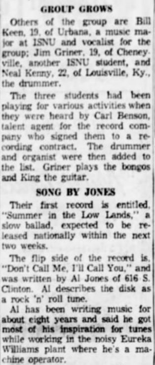 Ich habe jetzt alle Bill und Billy Keens, die ich bis 1963 gefunden habe, aufgelistet und dabei ist mir aufgefallen, dass drei der Labels aus Kalifornien stammen und nur das Label LESLEY in Louisville, Kentucky, zu Hause ist. Da die Interpreten aus Kalifornien alle mit Vornamen Billy heißen und ausgerechnet jener aus Kentucky ”nur” Bill heißt, kann ich schwer an einen Zufall glauben und bin daher hinsichtlich der Identität äußerst skeptisch.