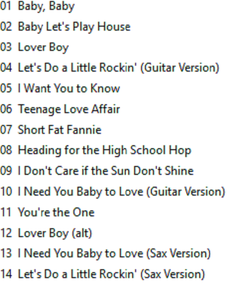 Von "I Need You, Baby, To Love", "Let's Do A Little Rockin'" und "Lover Boy" gab es je zwei Takes und zusätzlich gab es noch die Aufnahme "You're The One"