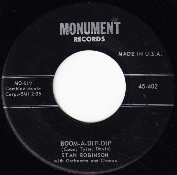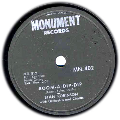 Georgian Stan Robinson was one of the first artists signed in 1959 to Fred Foster's Monument Records, a label newly formed in Nashville. "Boom-a-Dip-Dip,", his first record for the label, was a hit in the spring of 1959 (#83 on the charts.).
