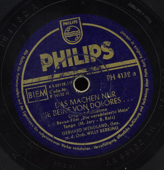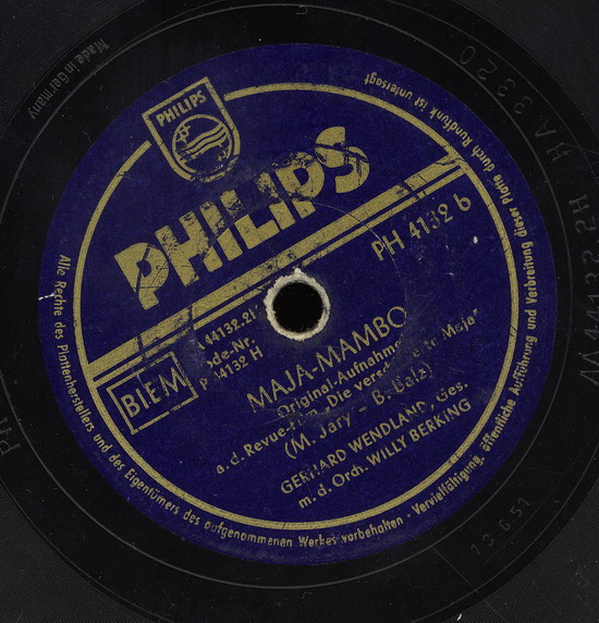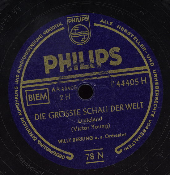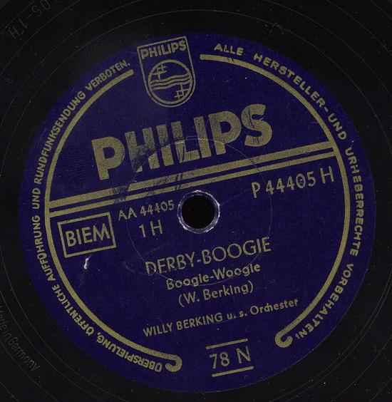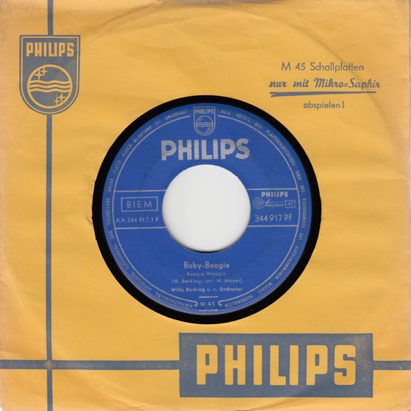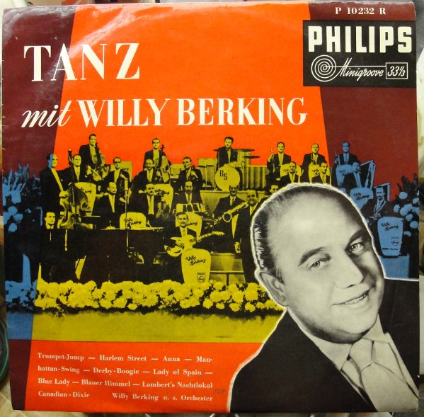 seit 1951 WILLY BERKING und sein Orchester auf Philips (WILLY BERKING-arr, ld, FRITZ PETZ-tp, RUDI THOMSEN-tp, HERBERT REICH-tp, EGON KÜSTER-tp, ERICH WELL, ERNST STÄHR, HEINRICH HOFMANN-tb, ALBERT MANGELSDORFF-tb, MENNO BOLT-ts, PHILIPP RÖSSER-ts, HEINZ KRELL-as, ARTHUR KOPPERNOK-as, WALDEMAR HELBOURG-bars, HEINZ SCHÖNBERGER-cl (ging anschließend zum RIAS), LOUIS FREICHEL-p, WERNER DIES-g, RUDI WEGENER-b, WILLY SCHMIDT-d, BENNO SCHILLING-d, zusätzlich HORST FISCHER-tp (ab 1954), BILLY MO-solo-tp (1958) u.a. PH 4113 "Bim-Bam-Bum"/"Sowas Tun Die Herrn"-1951, P 44369 H "Blauer Himmel"/"Heiße Küsse (Kiss Of Fire)"-1953, "Die Rote Blume Von Den Blauen Bergen"-1956),