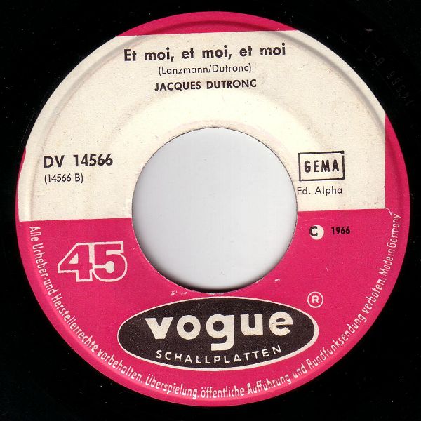 Bei diesem Beitrag (links klicken) kann man eine italienische VOGUE aus dem Jahre 1964 sehen, die auf dem Label den Vermerk © 1962 aufweist, was etwas verwirrend ist. Auch bei der italienischen VOGUE J 35086x45 A/ B (CHRISTOPHE accompagné par Jacques Denjean "Aline"/"Non ti amo piu'") scheint das Jahr 1962 auf und die stammt bereits aus dem Jahre 1965.