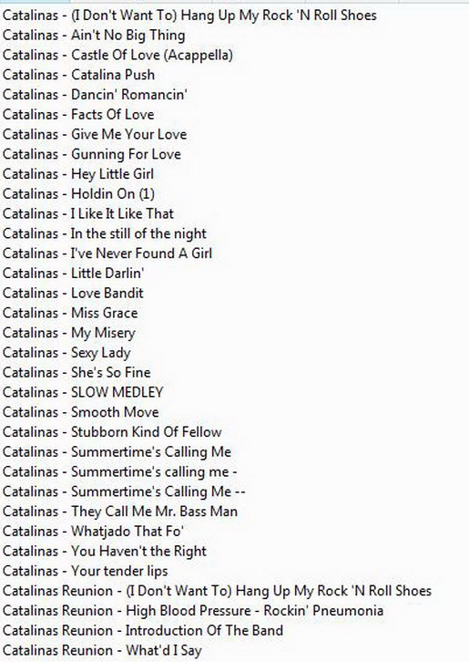 Auch Catalinas gibt es wie Sand am Meer, man braucht nicht einmal die 1962er-Grenze überschreiten. Ich werde daher versuchen, die diversen Formationen übersichtlich zu ordnen. Diesmal mache ich auch den Versuch, Vokal und Instrumental zu trennen.