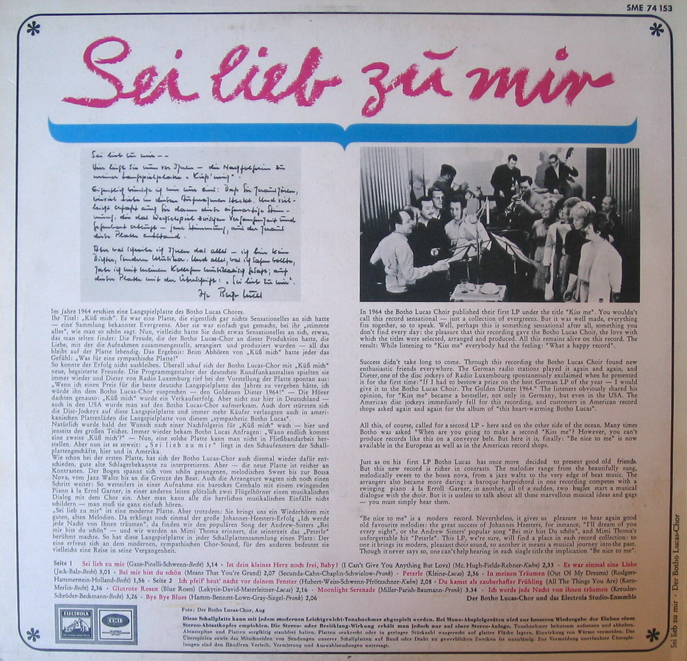 seitdem sind unzählige Schallplatten von BOTHO LUCAS erschienen, die ihn mal als Solist o. Duettpartner u. mal im Trio, später Quartett o. Chor u. in diversen Pseudonymgruppen vorstellen,