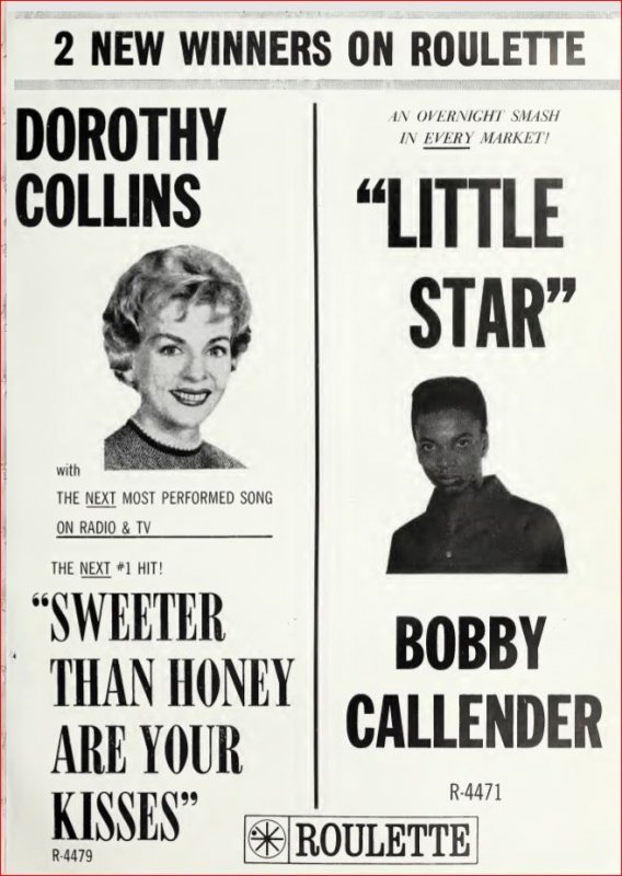 Meine Disco hat auch schon mit 1961 begonnen aber du hast recht, es fehlt noch einiges, weshalb ich die Single-Disco nun völlig neu erstellt habe. Unsicherheit gibt es noch darüber, ob Bob Callender auf GOLD und Bobby Callender ident sind. Die Identität von Bobby Calendar auf der ersten ROULETTE mit den restlichen Bobby Callenders dürfte gegeben sein.