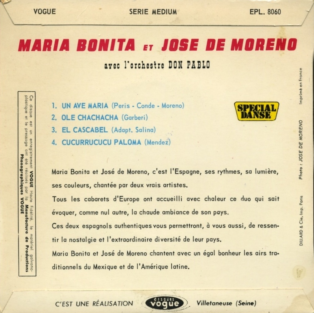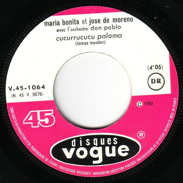 maria bonita et jose de moreno avec l'orchestre don pablo….cucurrucucu paloma (VOGUE V. 45-1064)