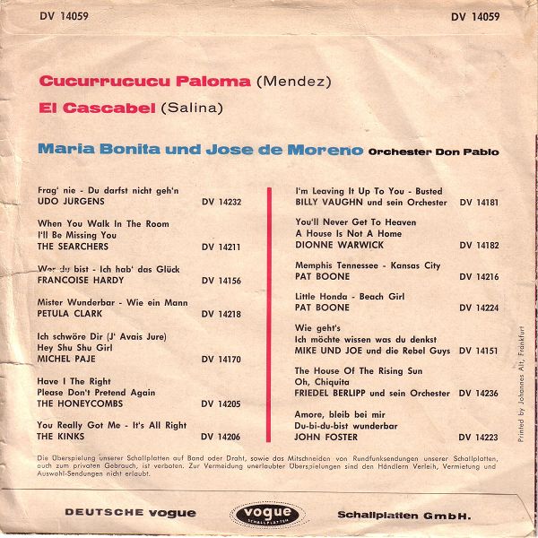 Wie bekannt die Version von Maria Bonita et Jose de Moreno auf VOGUE war kann ich leider nicht abschätzen. Jedenfalls wurde diese Version etwa Mitte 1963 mit der deutschen VOGUE-Nummer DV 14059 versehen und im deutschsprachigen Raum (wenn es die V. 45-1064 bei uns bereits gegeben hat sogar neuerlich) angeboten. Die dritte Phase macht einen größeren Sprung nach vorne. Die Bildhülle stammt nämlich aus dem Jahre 1965, wie man an den auf der Rückseite angeführten Angeboten leicht feststellen kann.