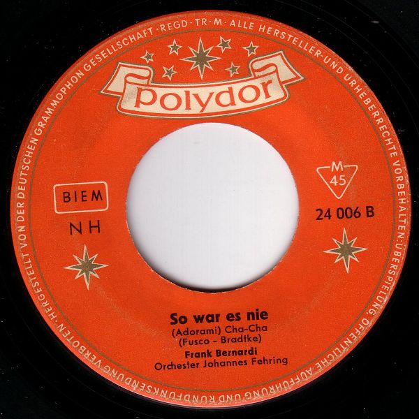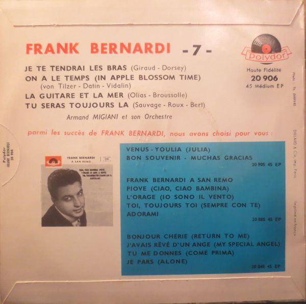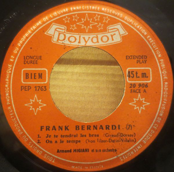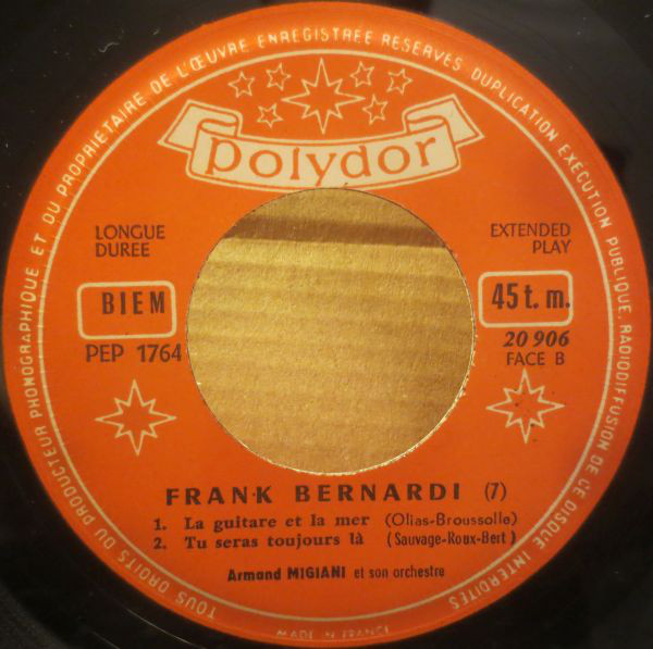 Auch über die in Frankreich nur für die Jukeboxes hergestellten Singles fand ich ebensowenig Hinweise. Vielleicht gab es von Frank Bernardi tatsächlich keine "Juke Box-Singles". Für die folgende Disco habe ich daher die in Frankreich regulären EPs verwendet. Interessanterweise wird er bei seiner EP "Frank Bernardi a San Remo" (20 885) vom Orchester Kurt Edelhagen bzw. vom Orchester Johannes Fehring begleitet.