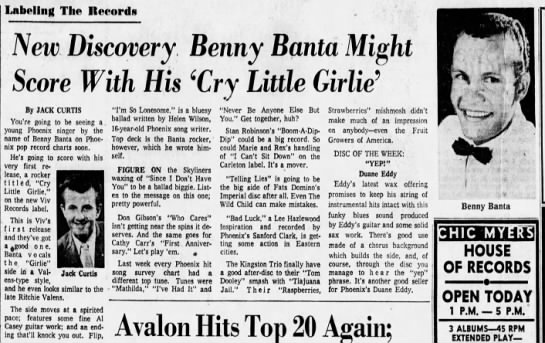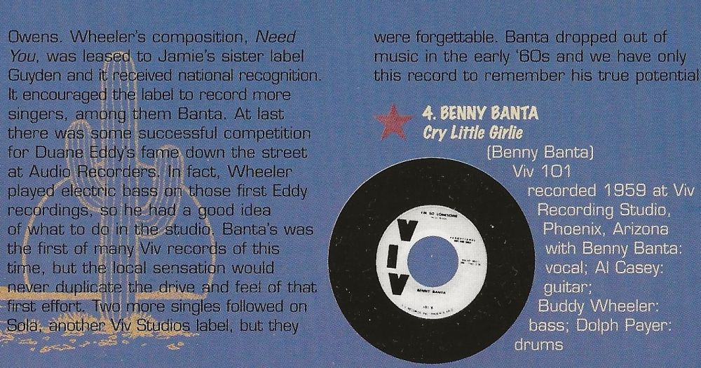 Von Benny Banta weiß ich lediglich, dass Loy Clingman nach Übernahme des VIV-Labels, etwa im Sommer 1959, ihn als ersten Interpreten veröffentlicht hat. SOLA gehörte übrigens auch zum Bereich Clingman in Phoenix, Arizona, quasi als VIV-Sublabel