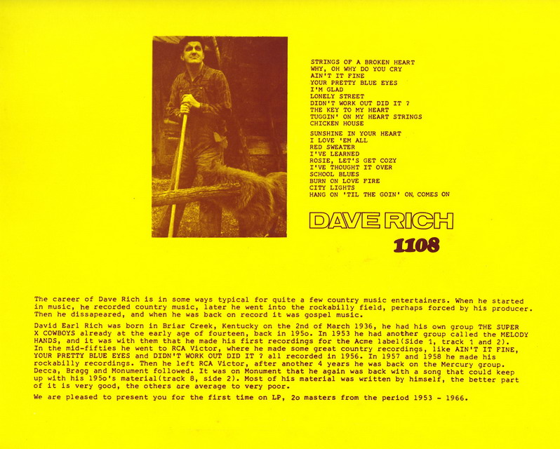 Der Country-Sänger, Gitarrist und Songwriter Dave Rich wurde am 3. Februar 1936 in Briar Creek, Kentucky, geboren. Ab 1956 wirkte er regelmäßige bei den Country-Sendungen "Louisiana Hayride" bei KWKH, in Shreveport, Louisiana, und "Hillside Hoedown" bei WEHT-TV in Henderson, Kentucky, mit.