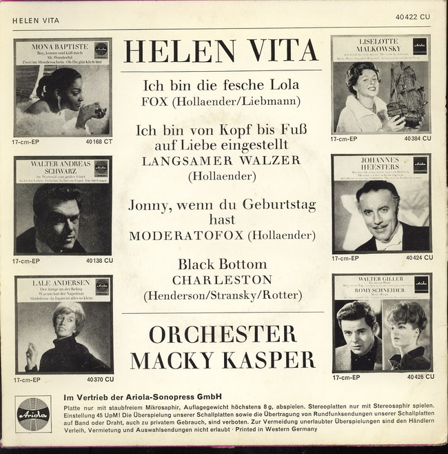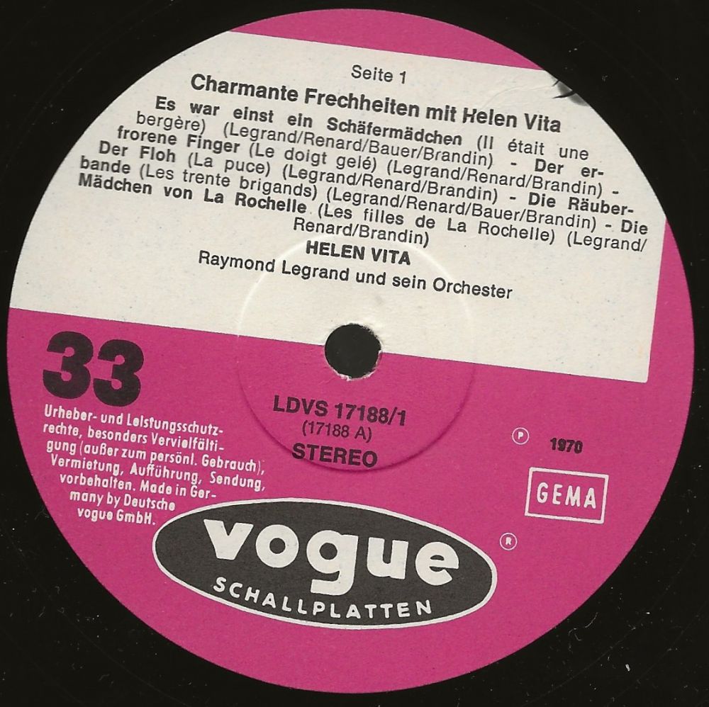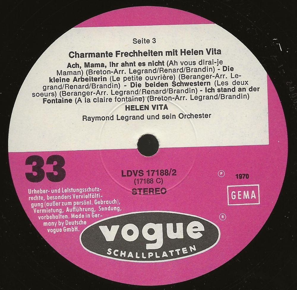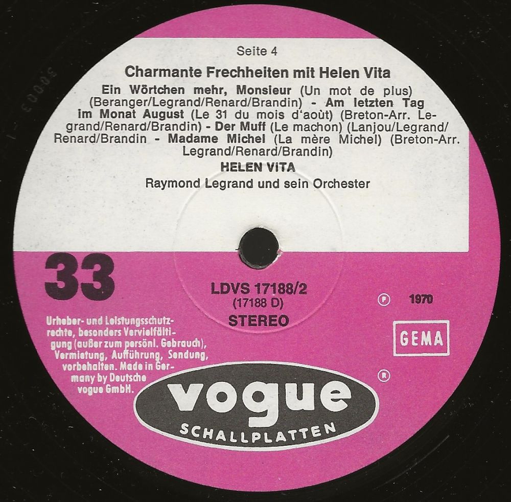 ab 1963 erscheinen nun Jahr für Jahr, mit geradezu preußisch inspirierter Präzision, eine LP nach der andern "Freche Chansons"-1963, "Noch frechere Chansons"-1964, "Die frechsten Chansons"-1965, "Die allerfrechsten Chansons"-1966, "Dolce Helen Vita 1"-1967 u. "Dolce Helen Vita 2"-1968,
