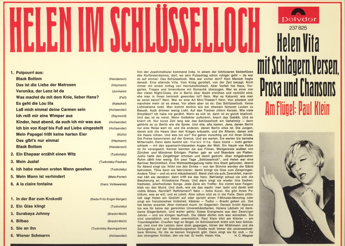 Solo-Programme wie "Helen Vita total", "Lotterlieder von Brahms bis Brecht" u. "Von wejen Liebe",