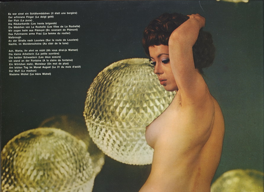 in den sechziger Jahren präsentiert sie in einer ganzen Schallplattenserie "Frech, frecher, am frechsten, am allerfrechsten" (alt-französische Lieder mit zeitlos-erotischem Inhalt, eindeutigen Zweideutigkeiten machen klar, was Männlein wie Weiblein, das bunte Völkchen aus Edelleuten u. Bettlern, Grafen u. Pfaffen, Gaukler u. Jungfern, Hofschranzen u. Huren, Ehrenwertes wie Lumpenpack, schon um das Jahr 1500 herum auf die Brücke von Avignon trieben)-mit dem Aufdruck "Für Jugendliche verboten!", ein Erfolg ohnegleichen,