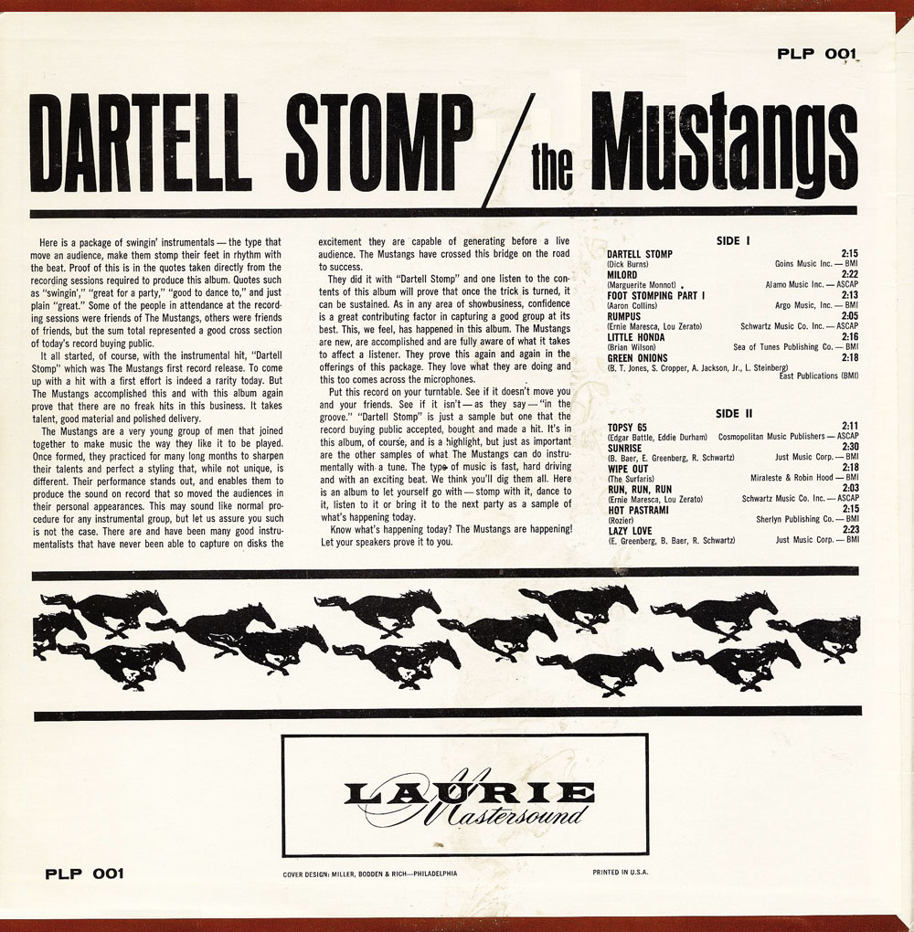 The Mustangs war eine US-amerikanische Gruppe aus New Jersey ursprünglich als Sandy & The Beachcombers bekannt. Die Geschichte der Mustangs begann 1959, als John Strand und sein Kollege Tommy Wright mit 12 Jahren an einem Talentwettbewerb an ihrer Schule teilnahmen. Sie haben zwar nicht gewonnen, aber das Ereignis gab ihnen die Idee, ihre eigene Gruppe zu bilden. Strand spielte Gitarre und Bass Wright. Ab Ende 1961 mit Paul Amadio (Schlagzeug) und Jack Fernandez war Keyboarder, ein Cordovox spielen. Das war der Anfang von Sandy & The Beachcombers. Die vier jungen Teenager aus New Jersey begann überraschend gut seine Karriere, spielen 3 oder 4 Tage in der Woche, zu der Zeit gut zu verdienen. Dann, im Jahr 1963 gab es eine Änderung, die zum Erfolg und Ruhm führen würde. Sie unterzeichneten einen Vertrag für professionelle Aufnahmen. Ein Billboard-Magazin-Editor, die relativ nahe gelebt, wo die Gruppe probte, gehört die Band zu spielen und entschied sich ihnen zu nähern und bieten ihnen ein Thema für eine Plattenfirma in New York zu berühren. Der Editor sagte ihnen, dass Providence Aufzeichnungen eine Gruppe benötigt "The Dartell Stomp", spielen ein Lied zuvor in der Aufzeichnungen Kuchen aufgezeichnet für eine Band The Viceroys genannt. Der Kuchen weggezogen aus der Wirtschaft und Providence erwarb die Rechte an dem Song. Junge Leute hatten jetzt sechzehn und nutzten die Gelegenheit. Die Vorsehung bot ihnen eine einjährige Plattenvertrag, der ein großer Nervenkitzel für Teenager war.