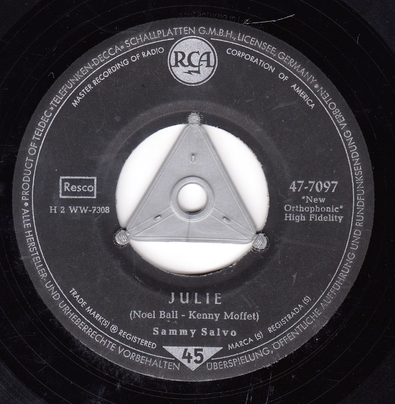 The first recording session set up for Sammy was to re-record the Mark V songs for RCA. Moments prior to the session, Salvo was given a tape of a just-released song by a Nashville recording group led by lead singer Dale Ward, called the Crescendos, doing a teen-type rock ’n roller called “Oh Julie” that had only been out about a week on Excello’s subsidiary label Nasco. Sammy did not know the song was released; he simply liked the sound. So he chose to record his own version of “Oh Julie”. On the B-side of the RCA single, he recorded Wayne Handy’s “Say Yeah” that had been released on the Renown label. Although it was the Crescendos’ version of “Oh Julie” that forged its way into the top five nationwide in December of 1958, Sammy’s version made it to a respectable #23 and probably prevented the Crescendos from garnering enough sales to reach #1. Many stations played “Say Yeah” because it too was a really good song, and the Crescendos’ version of “Oh Julie” was getting the bigger share over Sammy’s version on the A-side. Teens loved the “Say Yeah” side because it was a great dance tune. But “Oh Julie” was a success for Sammy. In fact, it was Sammy’s biggest hit.