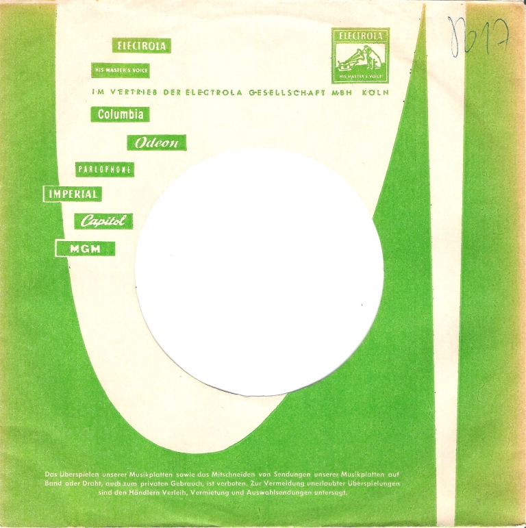 Ab 1958 steckten die Platten der Electrola und ihrer Tochter-Marken ja in den ähnlich gestalteten grün-weißen Electrola-Einheitshüllen, auf denen die einzelnen Tochter-Labels aufgeführt sind (siehe zweiten Scan zum Vergleich).
