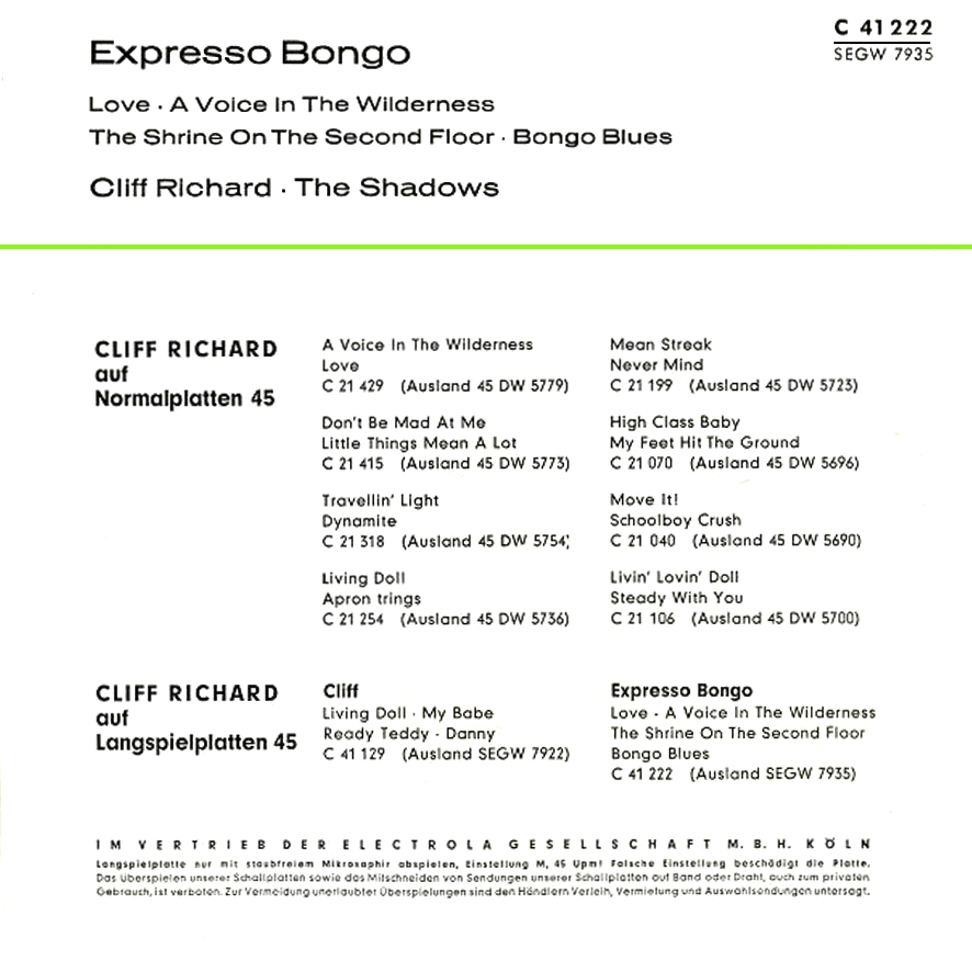 | Information: | EP COLUMBIA C 41 222 MIT BONGO BLUES DER SHADOWS |